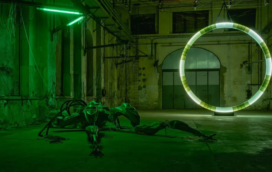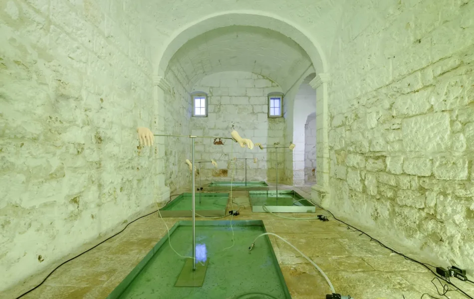 Arianna Ladogana’s installation “Tidal, Porous, and Fragmentary” is structured around four sculptural elements that evoke human bodies in a state of erosion and dissolution, immersed…