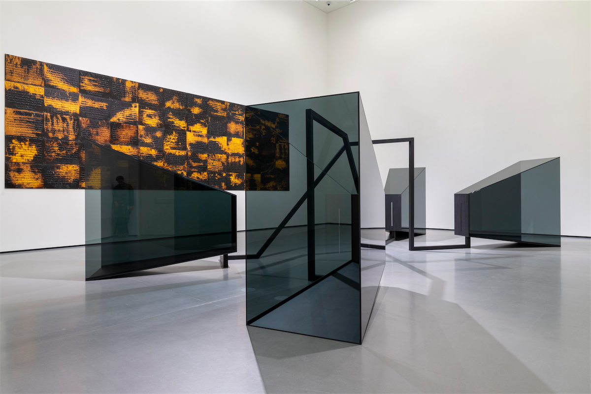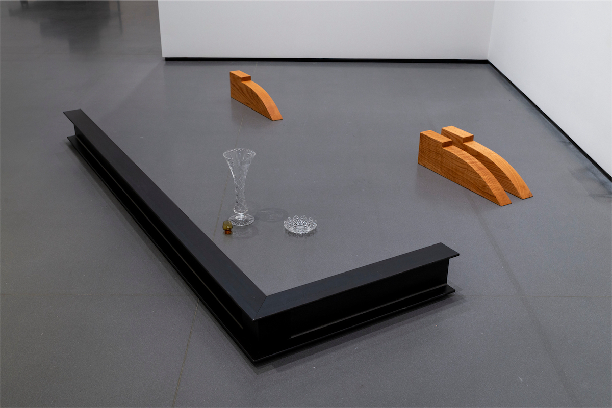 Hot rolled steel, red oak, and inherited glass objects 12 x 96 x 72 in., (overall footprint)