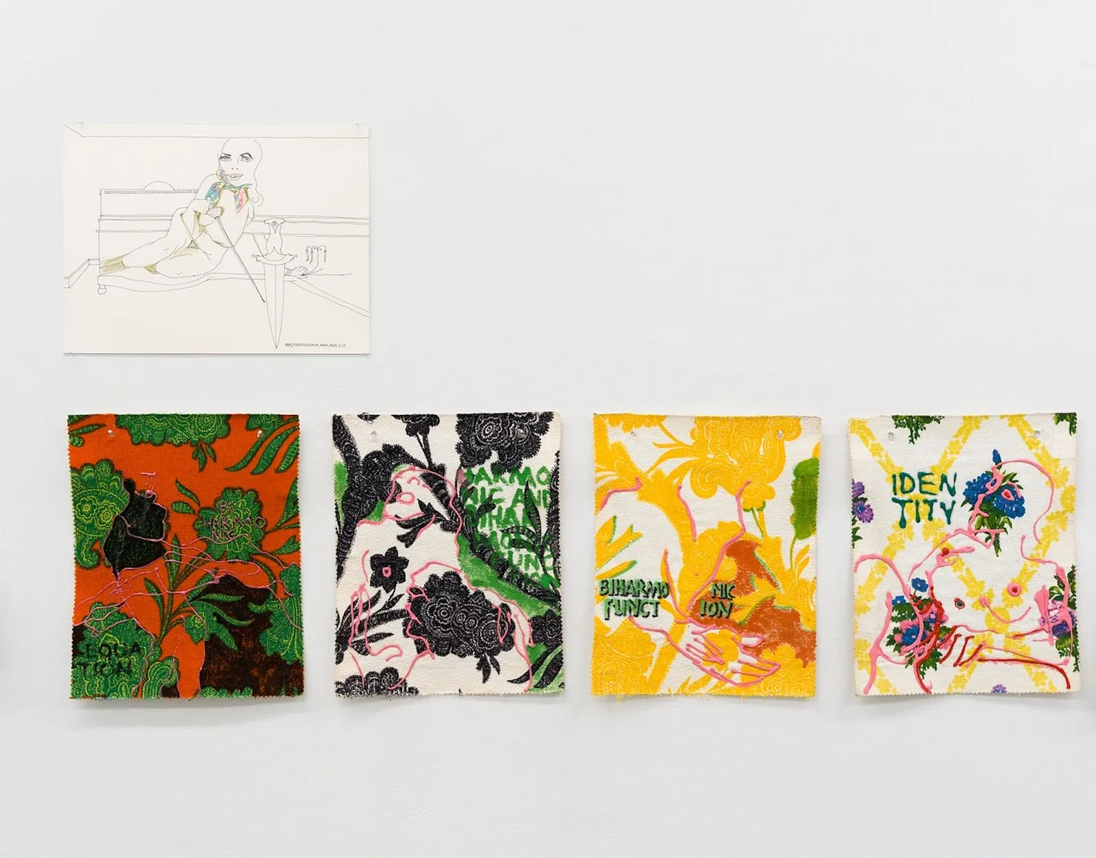 AMVK’s first journey to the empire state took place in 1979. During this trip, she acquired a number of books that became important references in her work. Among them was a Soviet engineering textbook “Theory of Elasticity” by Filonenko-Borodich, which informed her 1993 work Theory of Stress. Comprising of forty-five dayglo fabric samples depicting scenes of sexual intimacy and romance combined with descriptions of structures and machines under pressure. The work’s modular format underscores AMVK’s interest in the expansion and contraction of inner worlds, feelings, and ideas.