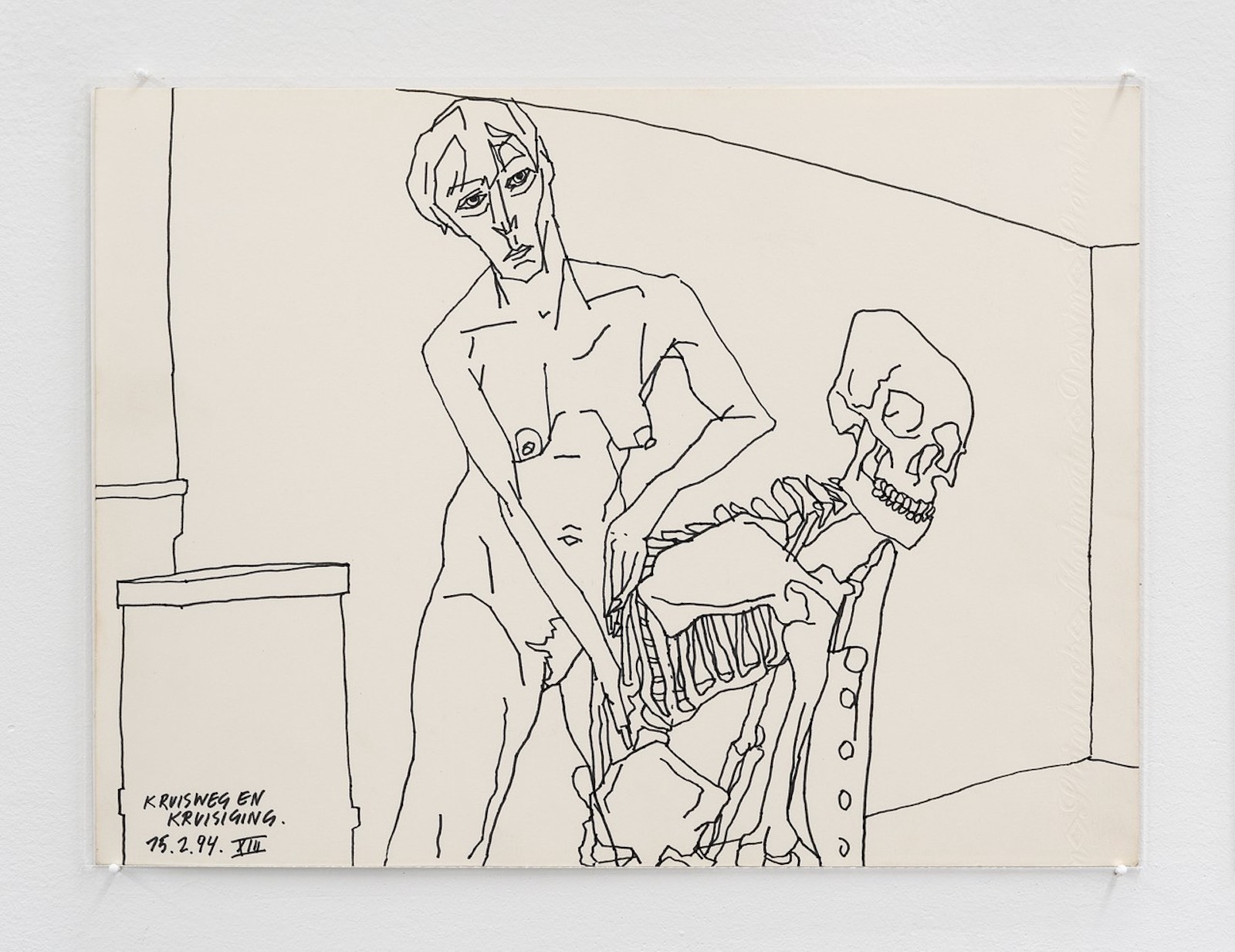 For the drawings God and Violence (1994), AMVK asked a friend to pose while magnetizing a skeleton. Before each session they read “The Sermon on the Mount” from the Gospel of Matthew. A woman is staged as a new Christ, returning the idea of death to the cycle of life.