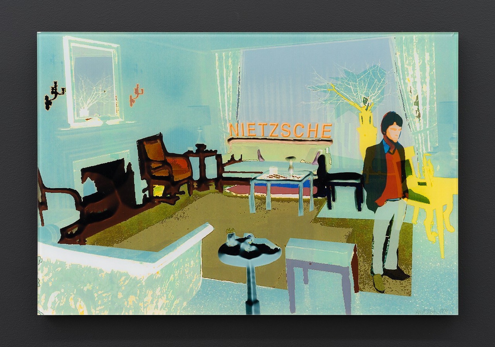 Diagnosis by the Eyes (1987) is a triptych based on a medical approach that studies internal organ imbalance through conspicuous facial symptoms. On the other hand, the Philosophical Rooms series distorts renderings of existing interiors as a function of ideas by thinkers like Maurice Maeterlinck and Richard Rorty.