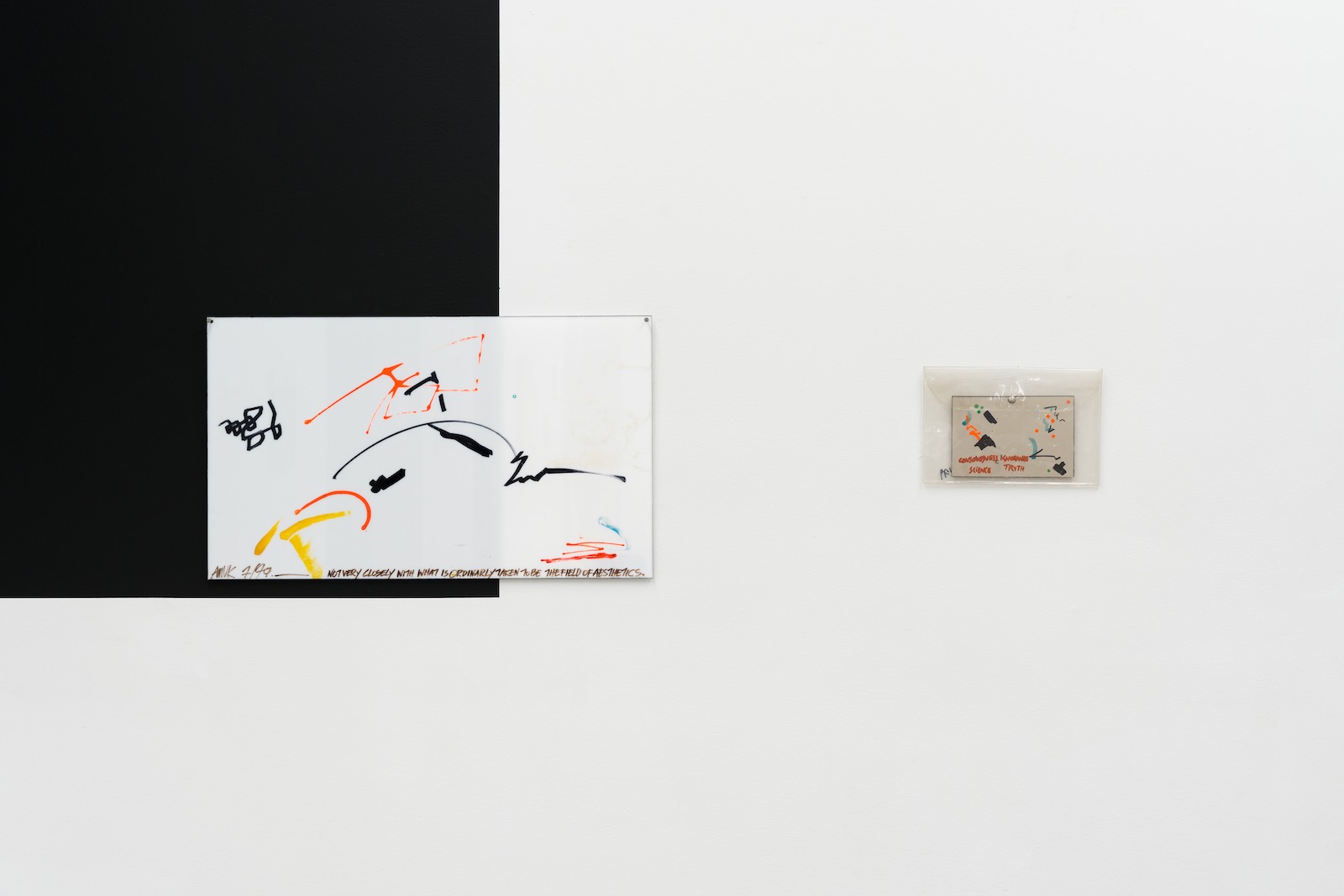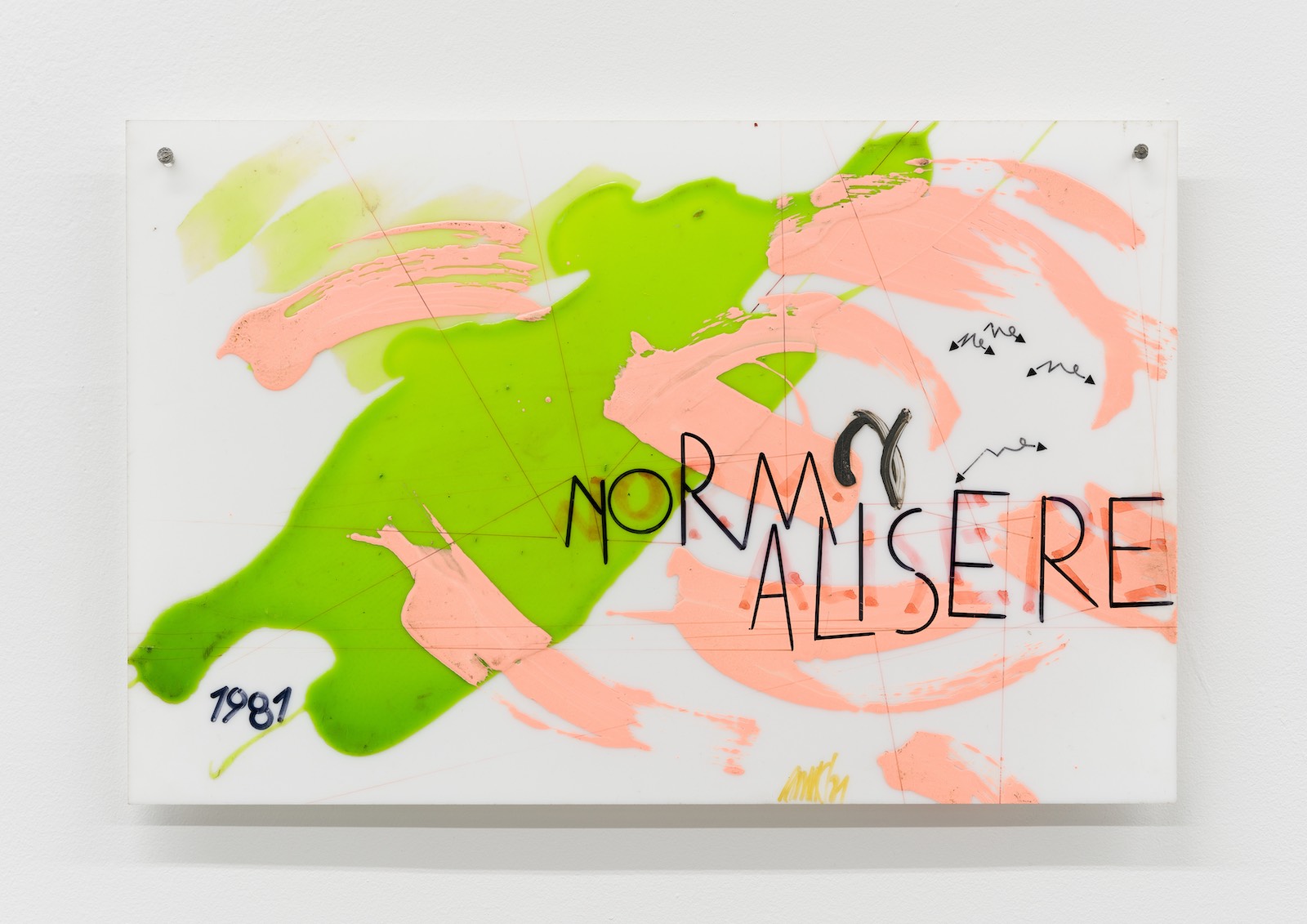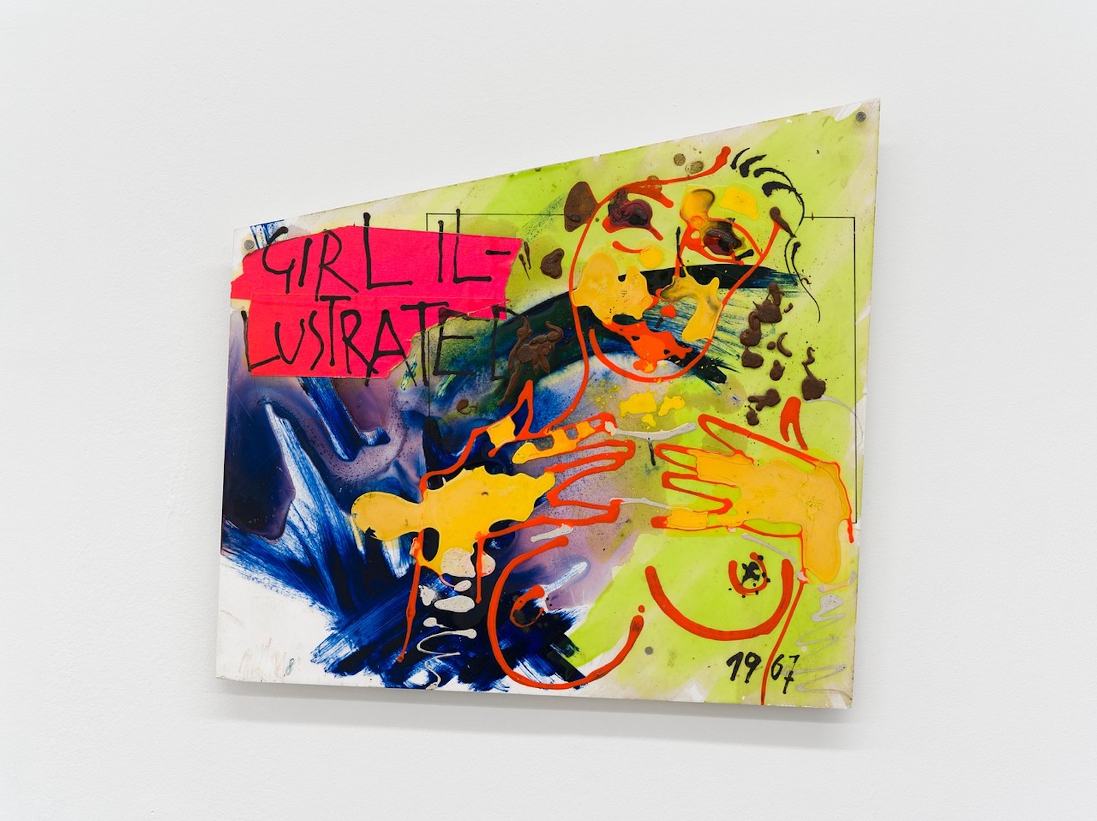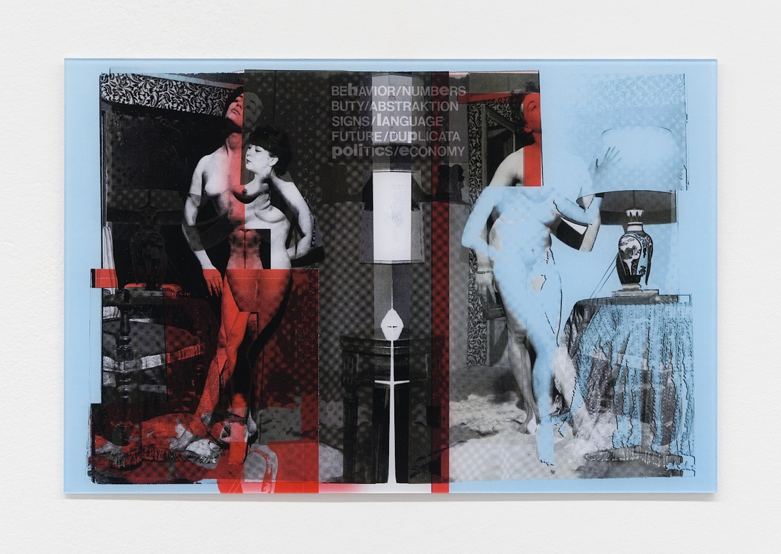 Partially in reaction to the 1972 “Limits to Growth” manifesto, AMVK made the denigrated material of plastic her primary medium. Her tactile interest in industrial materials, as well as the visual mechanics of advertising surrounding them, eventually led her to seek employment at a factory producing light boxes. She used discarded color plexiglass from this job to make works such as Girl Illustrated (1981) and Econom… + Chemis… Amusement (1981).