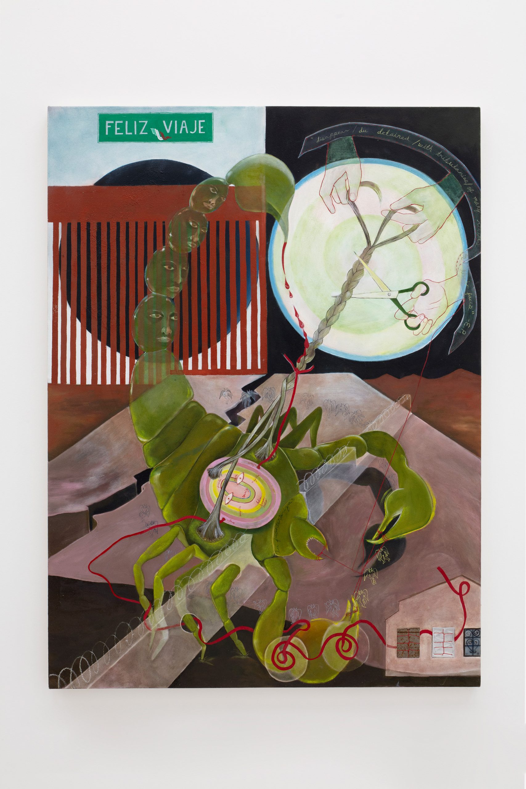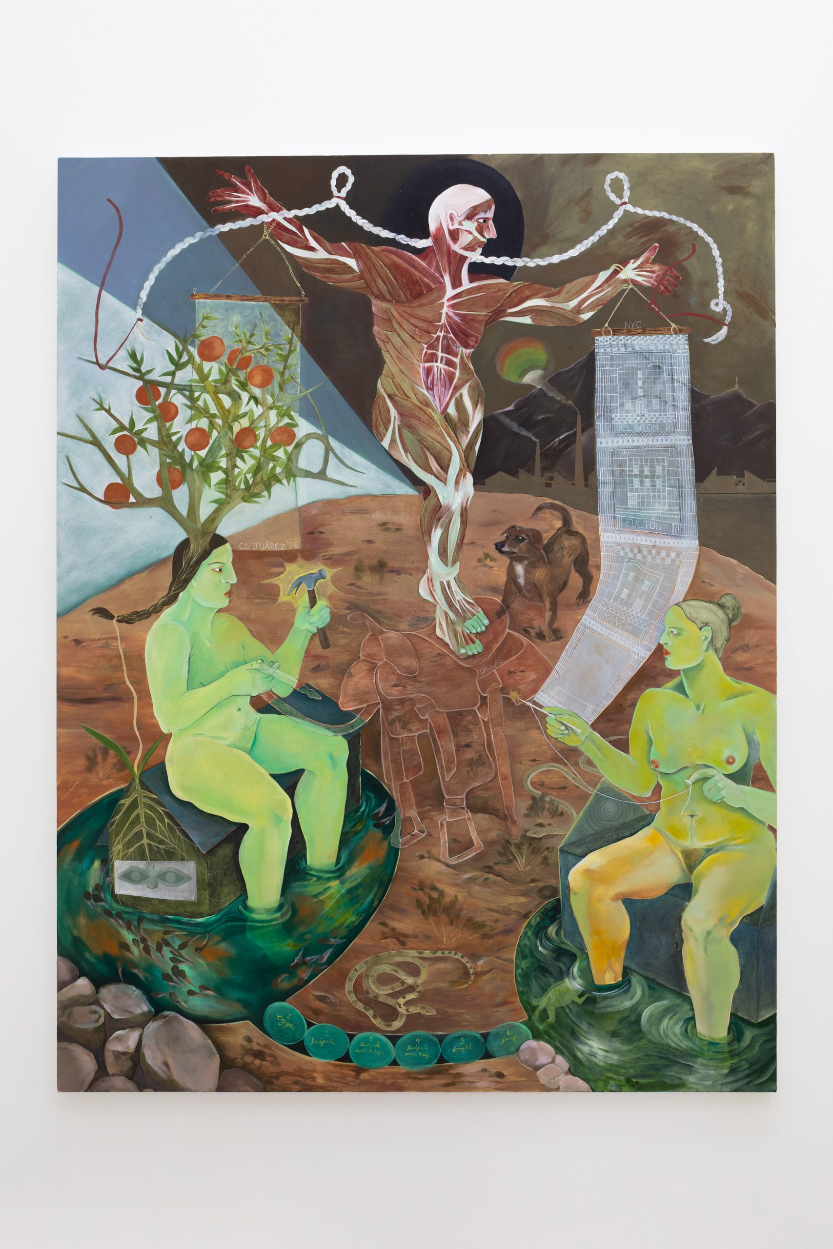 In The snake sings backwards Terrazas presents a new series of paintings and ceramic sculptures that together create a sacred space which honors duality and ideals of empathy and reciprocity. Informed by the geography of her childhood, Terrazas contends with borders both physical and psychological. Born in Juarez, Mexico, Terrazas as a child viewed the Mexican American border as fluid, porous, and arbitrary. This relationship was abruptly halted when, at the age of seven, Terrazas and her parents relocated to Dallas, Texas. In the largescale painting I have uneasy footing and the saddle is threadbare, 2024 Terrazas allegorizes the experience of straddling two worlds. Referencing Mexican devotional imagery, Terrazas depicts a monumental skinned figure floating above the earth holding two banners with her white braids. The figure on the left symbolizes the artist’s childhood in Mexico and can be viewed as the “builder” of Terrazas’s foundation. Her banner is filled by a blossoming orange tree that roots into her braid and then into the earth, while the figure on the right is still weaving her banner, the bottom of which is left empty with the promise of the future. The twin figures are tethered by a central transparent saddle, which symbolizes guidance, agency, and acts a portal for safe travel between borders.