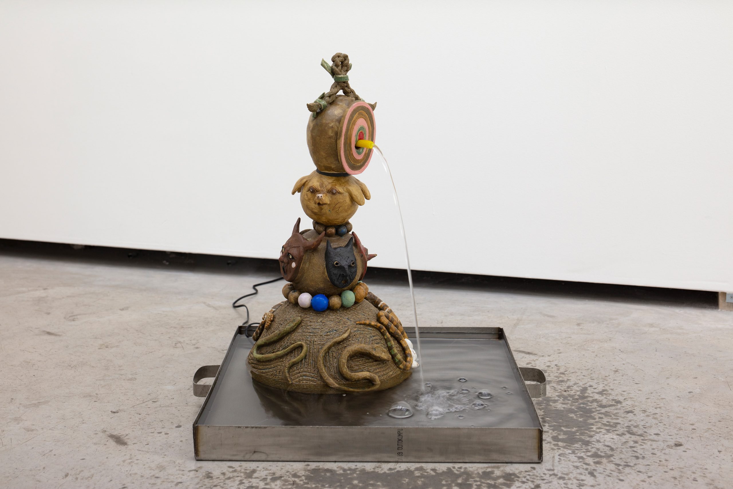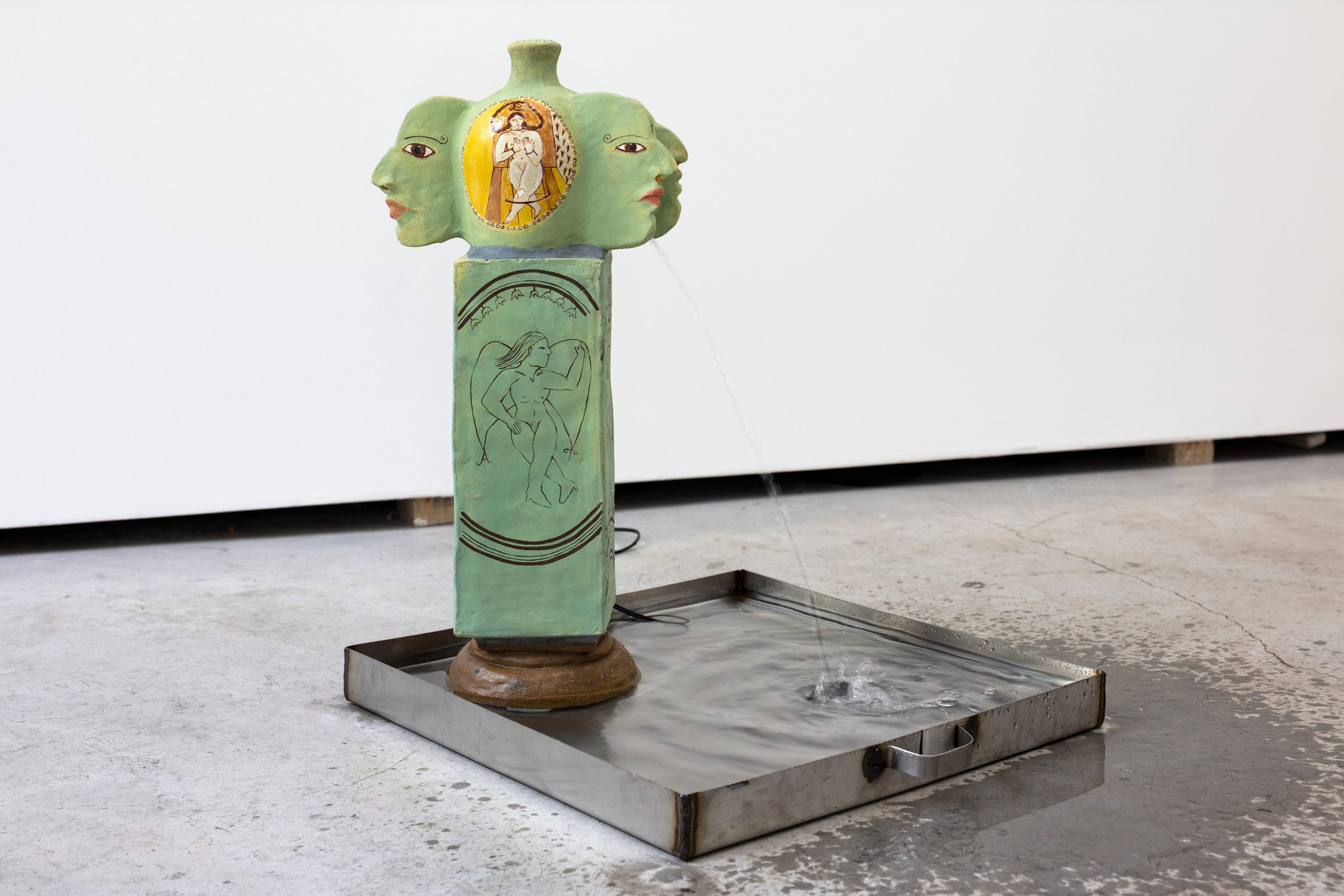 Alongside the paintings, Terrazas includes two hand built ceramic fountains which face towards each other from opposite sides of the exhibition space. Challenging traditional power structures which control the flow of water, the sister fountains metaphorically replenish themselves, revealing the individual’s capacity for reciprocity and regeneration. Terrazas’s interest in water is specifically tied to her relationship to the Rio Grande, a natural divide between the United States and Mexico. Works such as Mi Rostro, 2024 serves as a self-portrait of the artist, each section building upon and resupplying the next. In both sculptures, Terrazas reveals how individuals can take on the power of a fountain and become sites of radical empathy and abundant replenishment.
