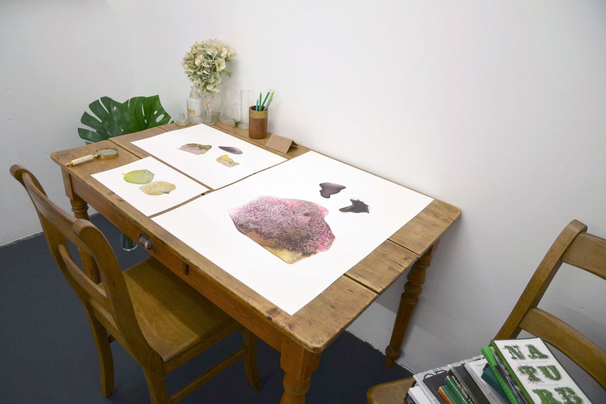 Moreover, in the fictional botanist’s study room, artworks invoke the taxonomical inspiration and research underpinning the botanical garden itself. Lisa Creagh digitally composes photographs of flowers into intricate floral patterns that are reminiscent of ancient Persian rugs, but also of historic ways of displaying flowers and plants in taxonomy books. Liz Orton’s photographs show folders with natural specimen awaiting classification in Kew Gardens Herbarium and Maren Simon’s paintings look like micro-organisms or minerals, currently being closely observed.