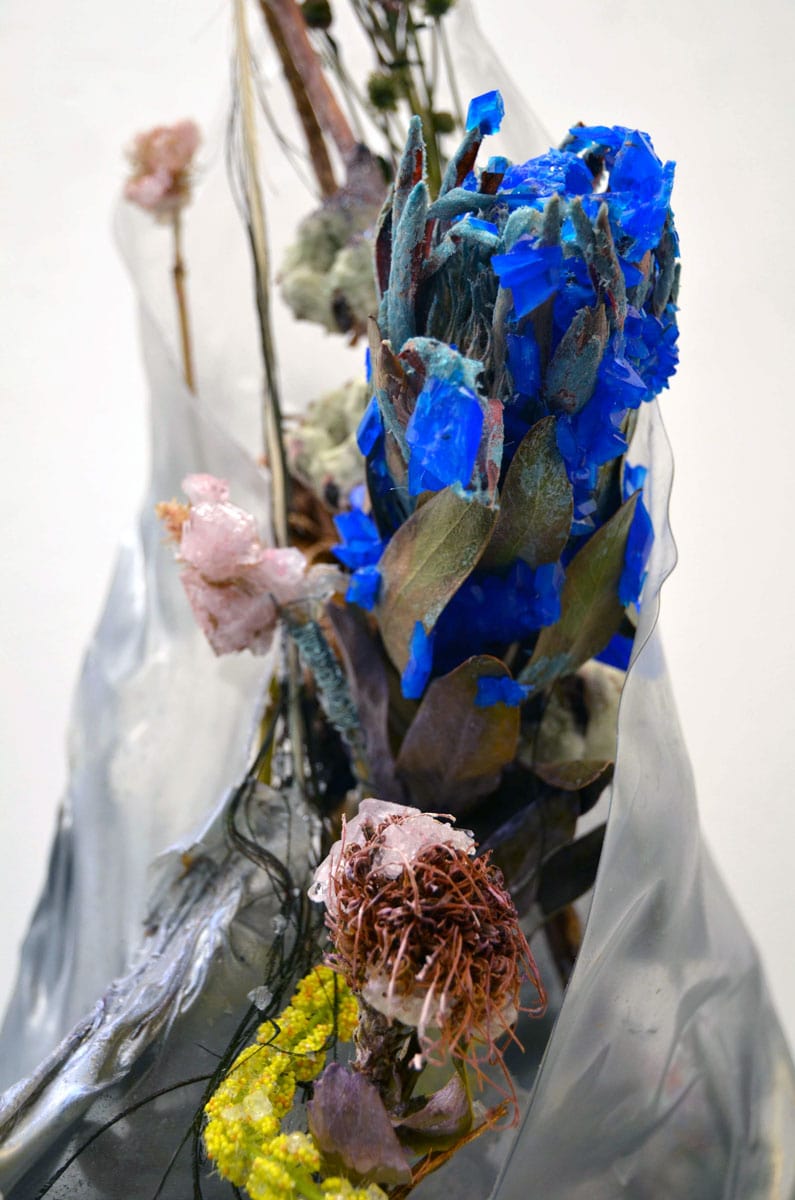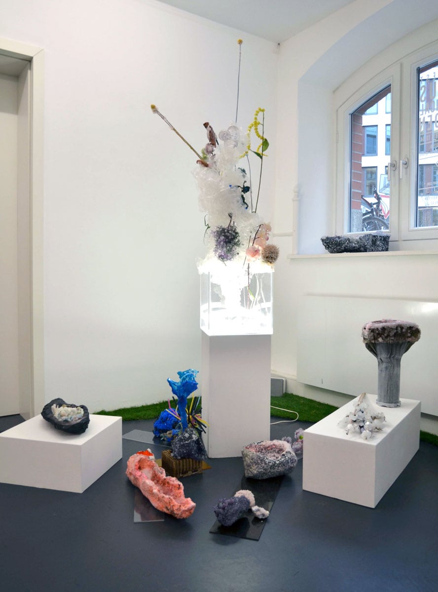 In the fake, or bogus, botanical garden, Giovanni Castell grows entirely artificial ecosystems through the use of computer programming, Janaina Mello Landini creates tree-like sculptures cascading down from the ceiling from more than 3000 metres of linen and rope, Jens Rausch’ paintings draw people in in the curious layers of natural settings, and Katie Spragg uses the versatility of ceramics to experiment with our idealized image of nature. Sadie Weis on the other hand generates a new nature by killing a preexisting one through her crystallization of flowers, plants and rocks. Lastly, Sakir Gokcebag’s minimal, conceptual work plays into the blurring of art and decor in the exhibition.