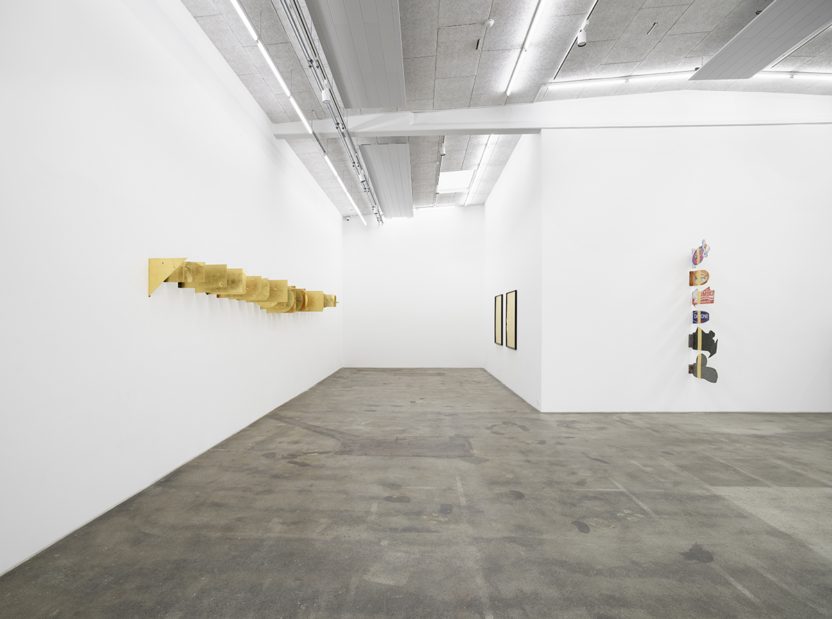 As a form of intimidation or by way of pastime, gunshots have perforated the street signs. Initially, the bullet holes come across as representations of violence. However, Escobar seeks to rethink the message of the found object, regarding the perforations as encoded messages – signs that we cannot read, but only approach more tangibly. While these bullet holes may represent the threats of everyday life, Escobar challenges our understanding of the statements with his application of a golden surface. The artist adds a reflective side to the object, thereby overwriting its original message. The language of the objects also shifts from reading to understanding. In this simple, yet powerful gesture, he transforms the holes into more abstract emblems, compelling his audience to view the world in a different light.
