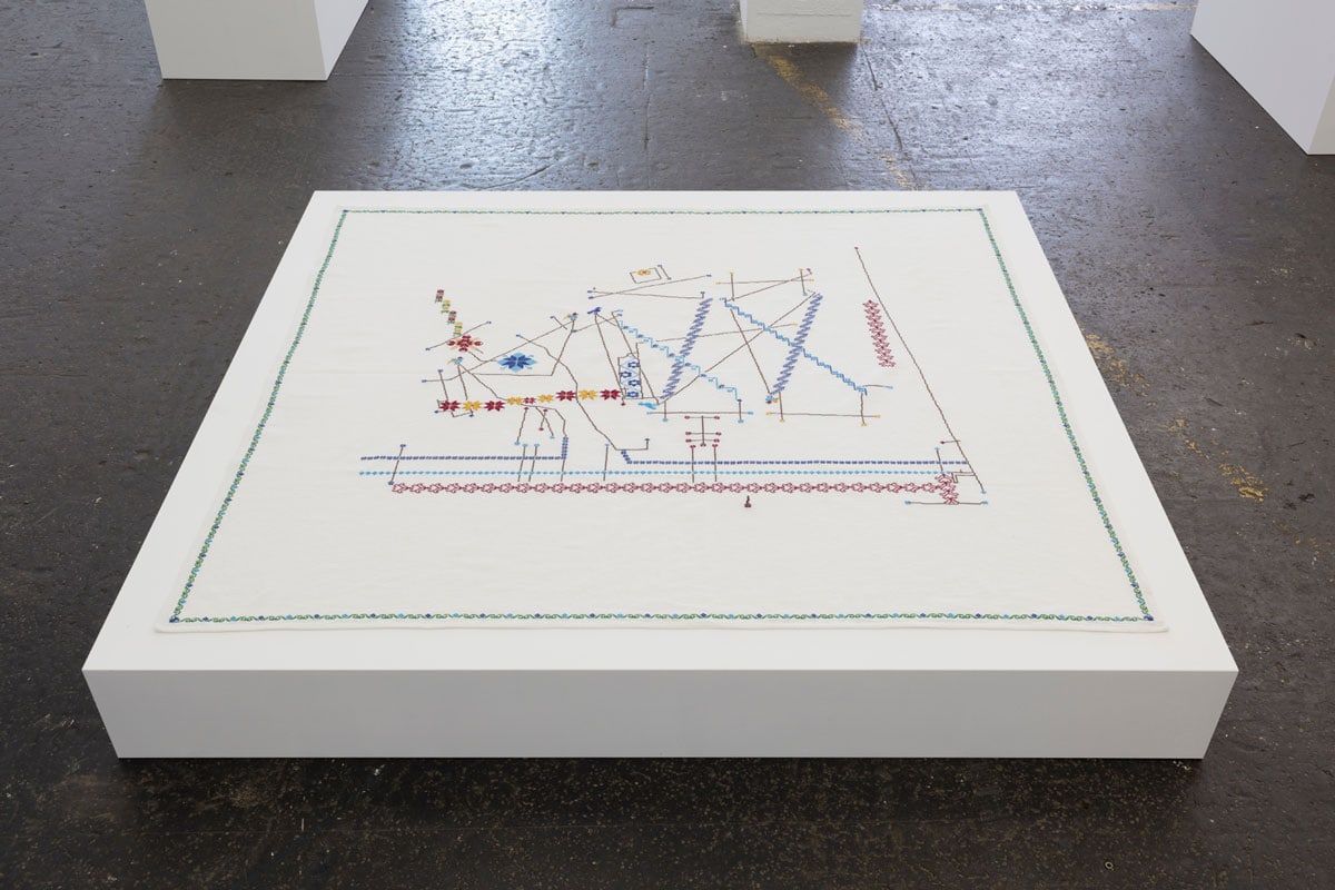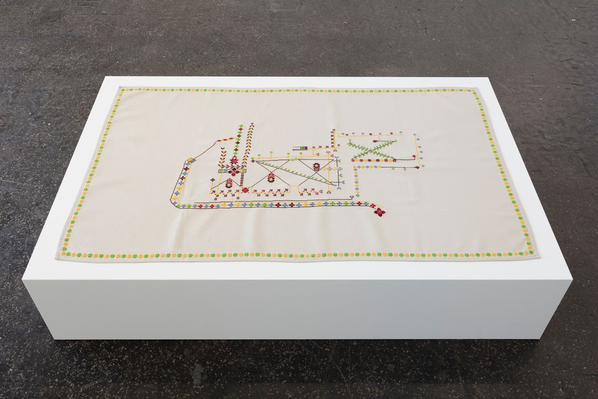 With frequent reference to her homeland Israel, Ella Littwitz uses relics, archaeological names, existing narratives, political symbolism and other historical and anthropological ciphers to develop her works of art. In the Kunst Halle Sankt Gallen, Littwitz focuses on territorialization: her installations, sculptures, drawings, and embroideries tell of claimed and conquered territory, of no-man’s-land, mixed territories, and not least of border crossing and migration.