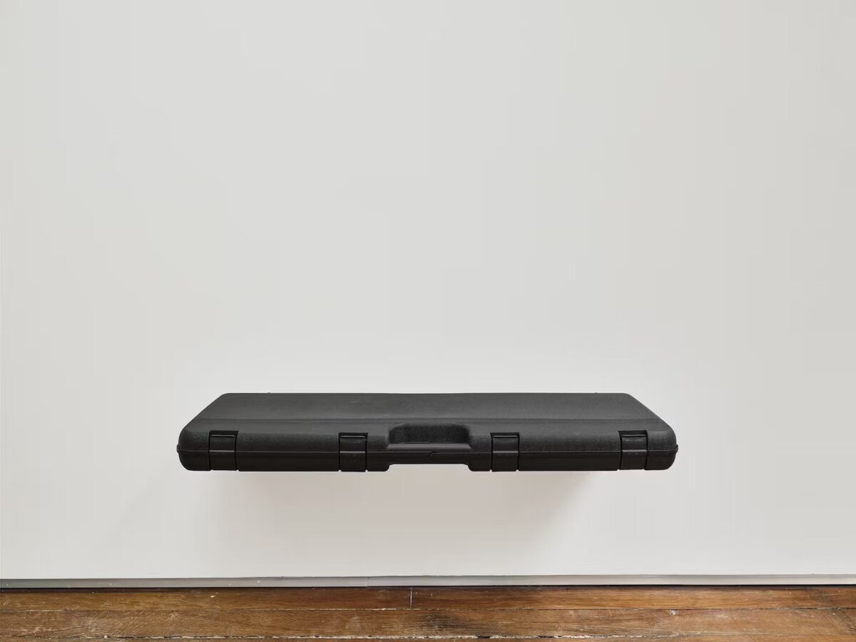 Adjacent Wiebe’s book floats the hardshell case used to transport the chain. Their lengths mirror each other, implying an interdependent relationship between the length of the chain, of the book, and of the film.
