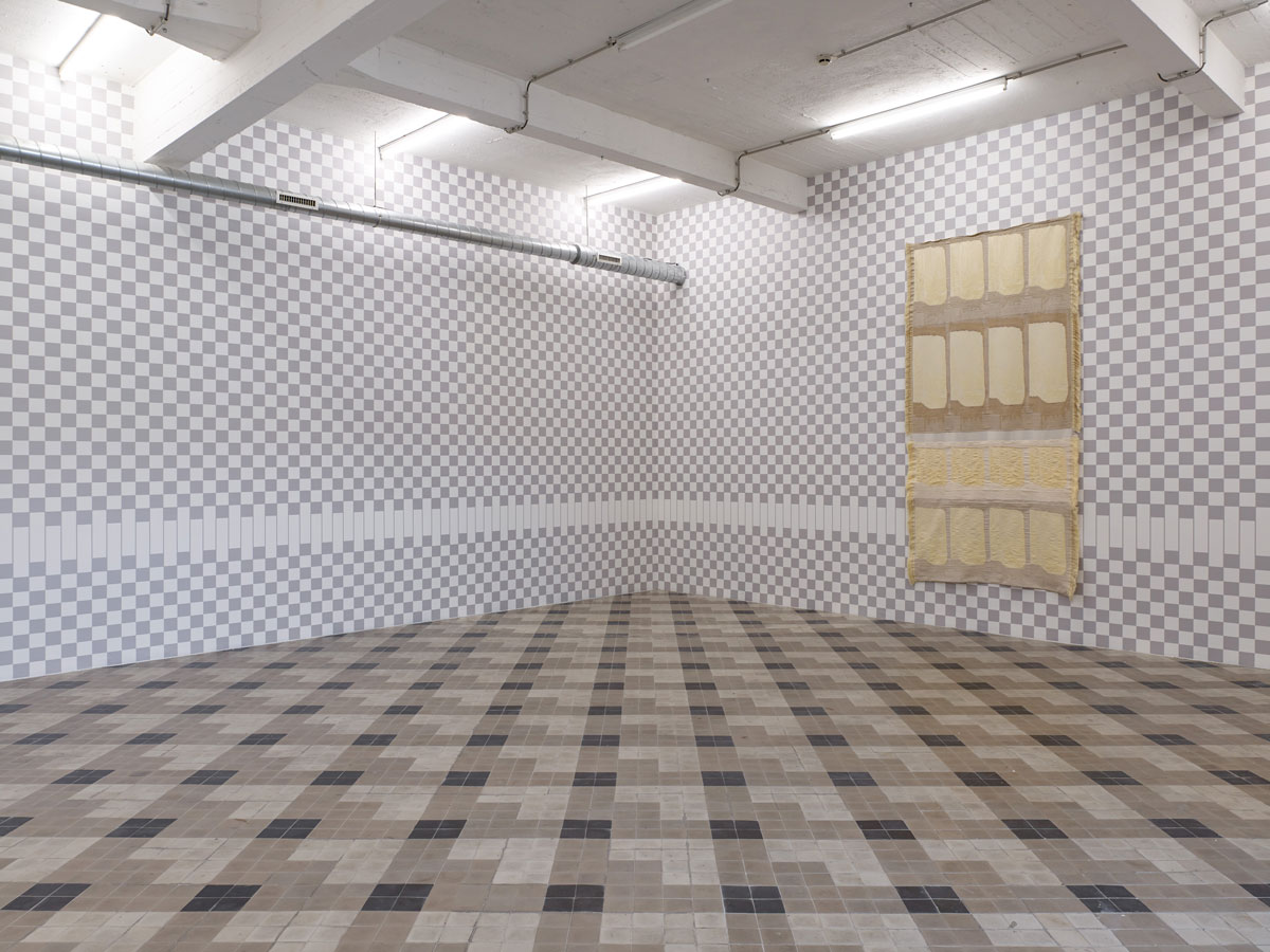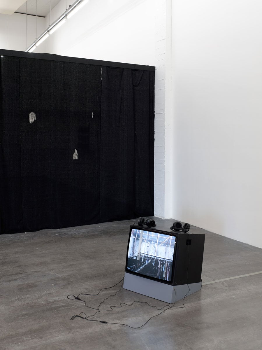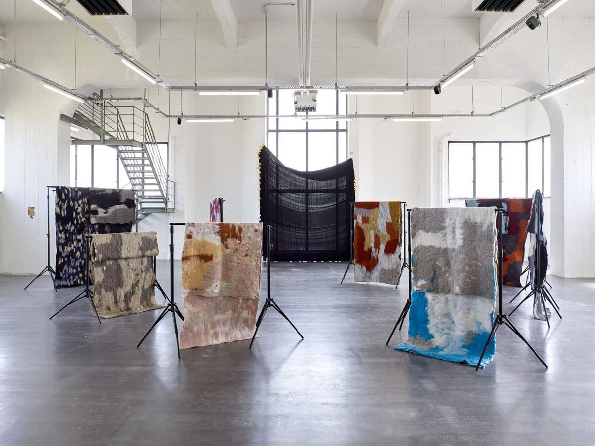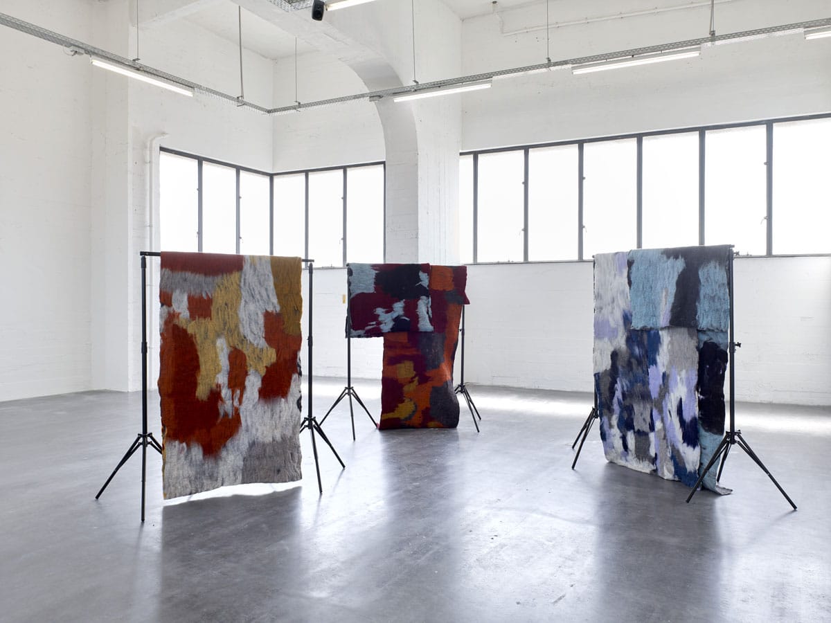 audio installation with 12 handmade felts (120 x 300 cm) on metal backdrop stands, courtesy of the artist. Installation view, Hana Miletić: Dependencies, WIELS, Brussels, 2018 © Kristien Daem.