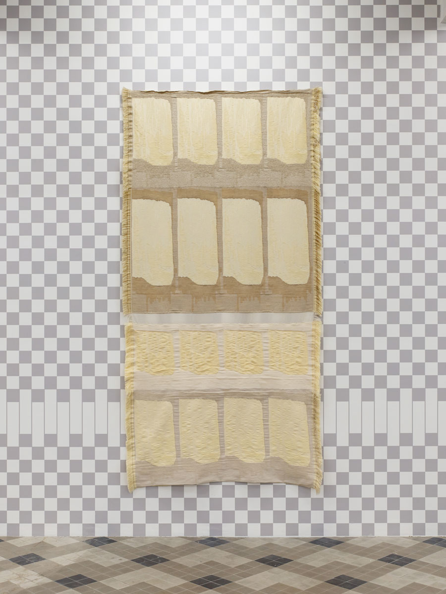 jacquard-woven textile manipulated by hand, 250 x 150 cm, courtesy of the artist. Installation view, Hana Miletić: Dependencies, WIELS, Brussels, 2018 © Kristien Daem.