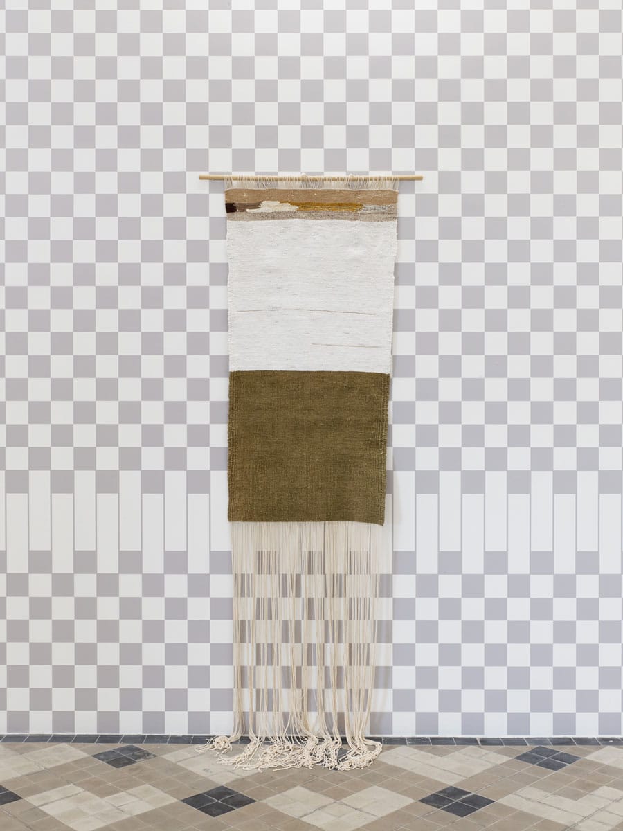 hand-woven textile, 200 x 75 cm, courtesy of the artist. Installation view, Hana Miletić: Dependencies, WIELS, Brussels, 2018 © Kristien Daem.