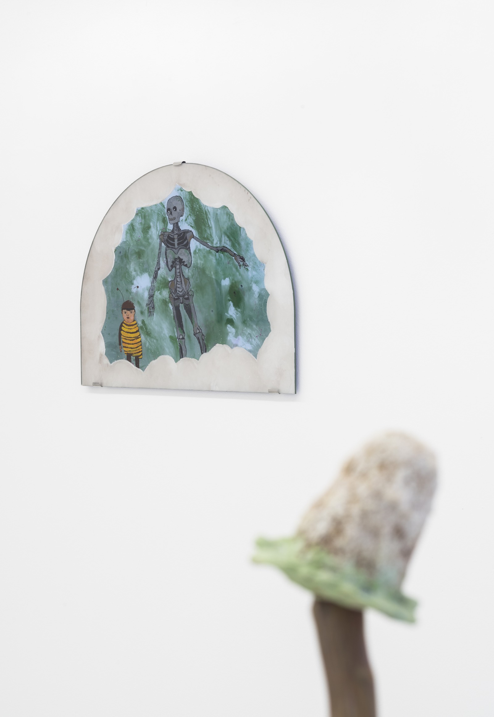 The exploration of fragility, transformation, and ambiguity continues in the reverse glass paintings. An inherent randomness in the technique lends the works a playful indeterminacy, allowing meanings to overlap and traditional notions to shift. Reminiscent of stained-glass windows, the pieces break free of religious narratives and instead conjure new possible worlds: a grim-faced bee figure juxtaposed with a skeleton reinterprets the classic dance of death motif, while elsewhere a cat provocatively obstructs the view of an exposed genital. Symbolically charged scenes brim with a sense of humorous lightness.