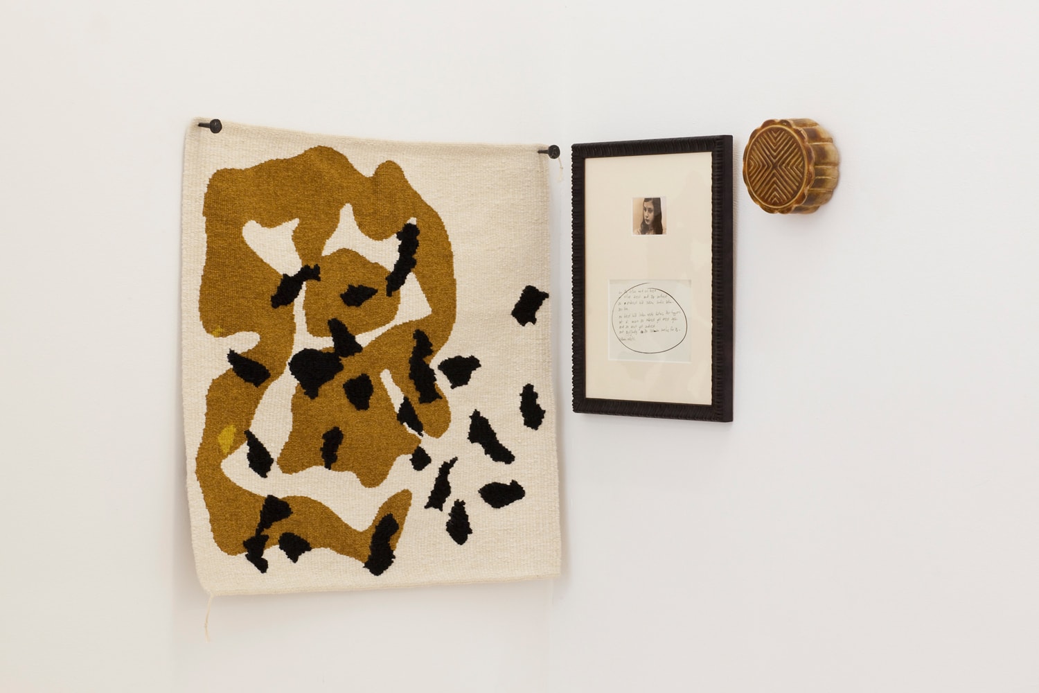 Hand dyed linen tapestry, iron nails, carved swamp kauri, stain, wax, framed archival digital print and ink on paper, passé partout 100 x 60 x 15 cm (approx.)