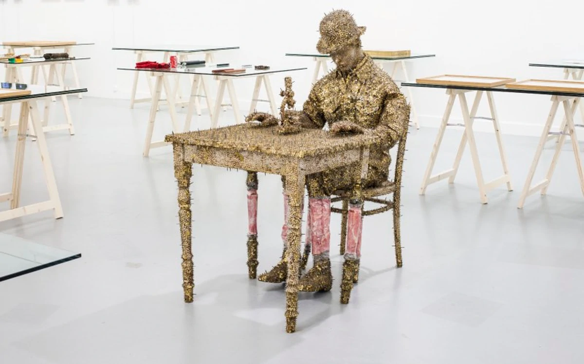 In Stigmata, the presentation has turned into a veritable sea of dozens of tables upon which are collected memories of performances in the most diverse of ways; by means of the objects used Fabre, or the scale models he calls ‘thought models’, as well as drawings, photos and all sorts materials that could be considered of ‘documentary value’. These disparate items regain, in this setup, a great sense of immediacy as the viewer is confronted with ever new impressions through the immediate, physical closeness with the tables and that which is presented upon it.