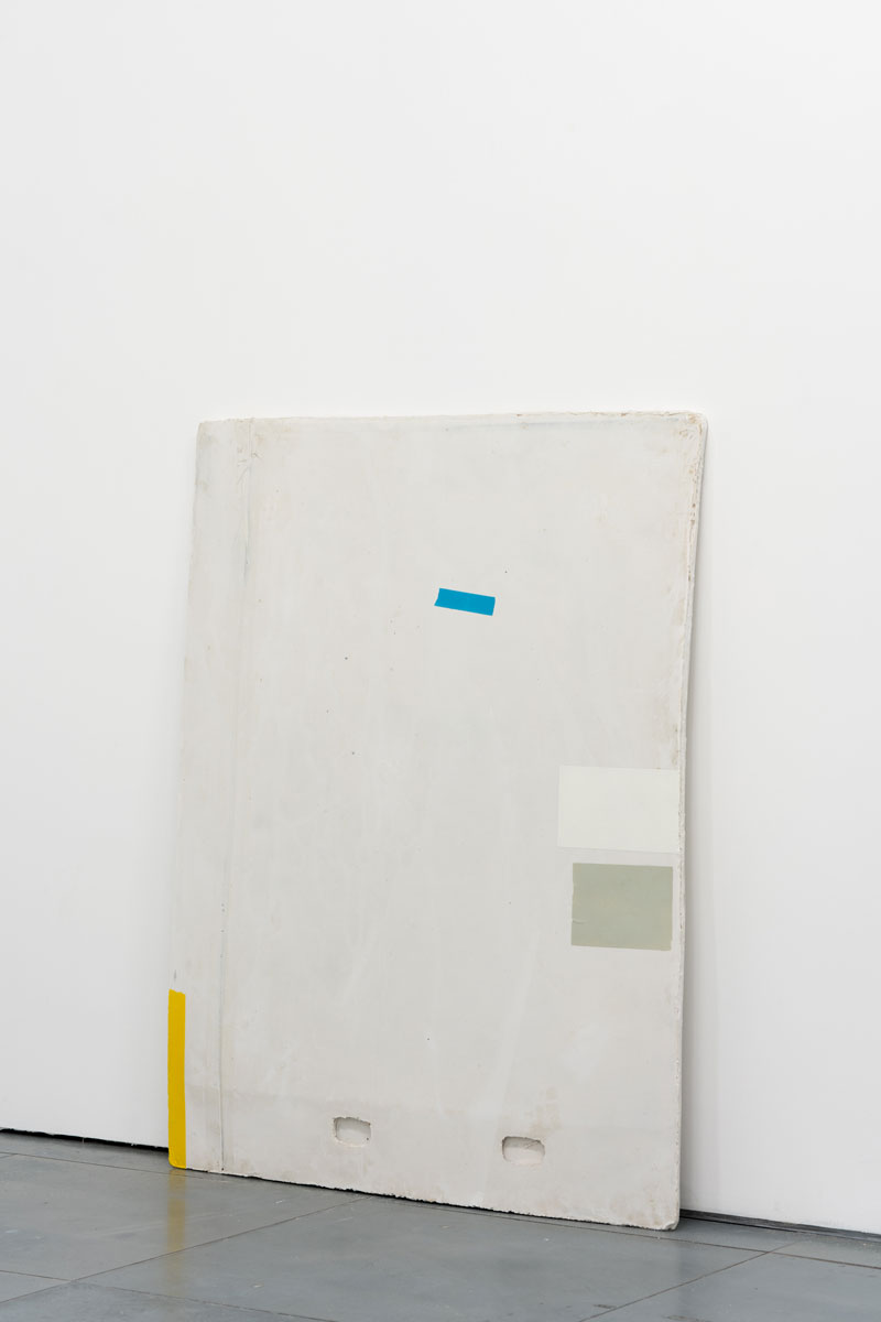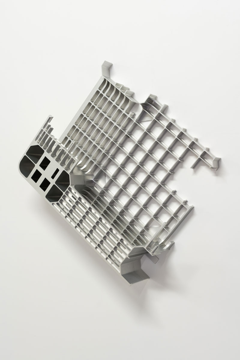Building on the dichotomy between creation and breakdown is the work ‘Pallet’ (2016), based on the corner of a broken cargo tray. Widely used in markets, the piece is associated with social exchange, marked by consumption; in its incomplete state, broken due to excess items, the work indicates exaggeration or abundance. Additionally, through its process of creation and the materials used – 3D scanning and subsequent reproduction in aluminium – ‘Pallet’ references actual building and constructs. In the context of Hong Kong, the surrounding physical works in the exhibition and the distant hum pervading the space (Mike Cooper’s ‘Ho’omanau nui’), ‘Pallet’ adds a further angle to the fabric of the exhibition, aligning it, evermore clearly, with a consideration of present day ruins, both visual and out of sight.
