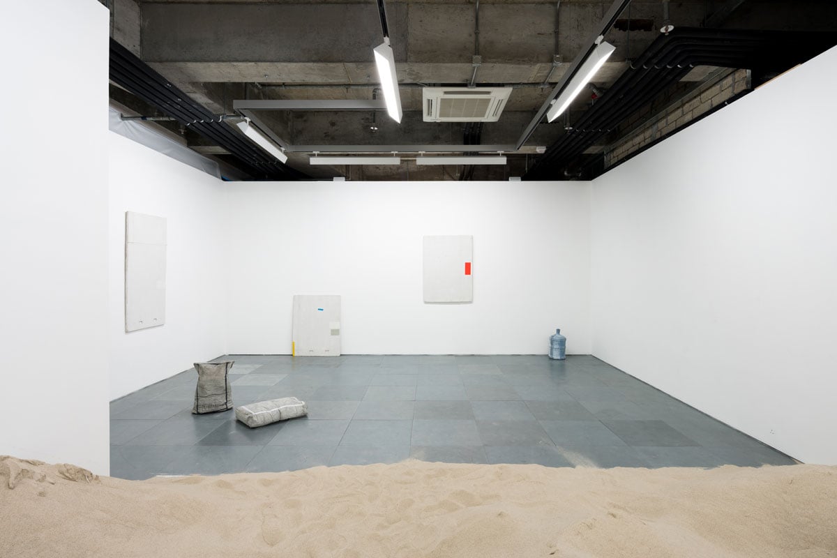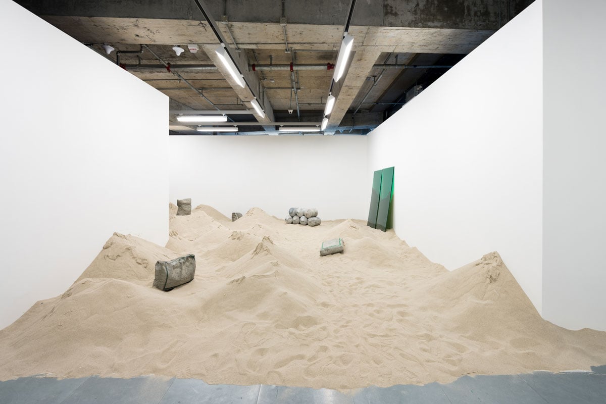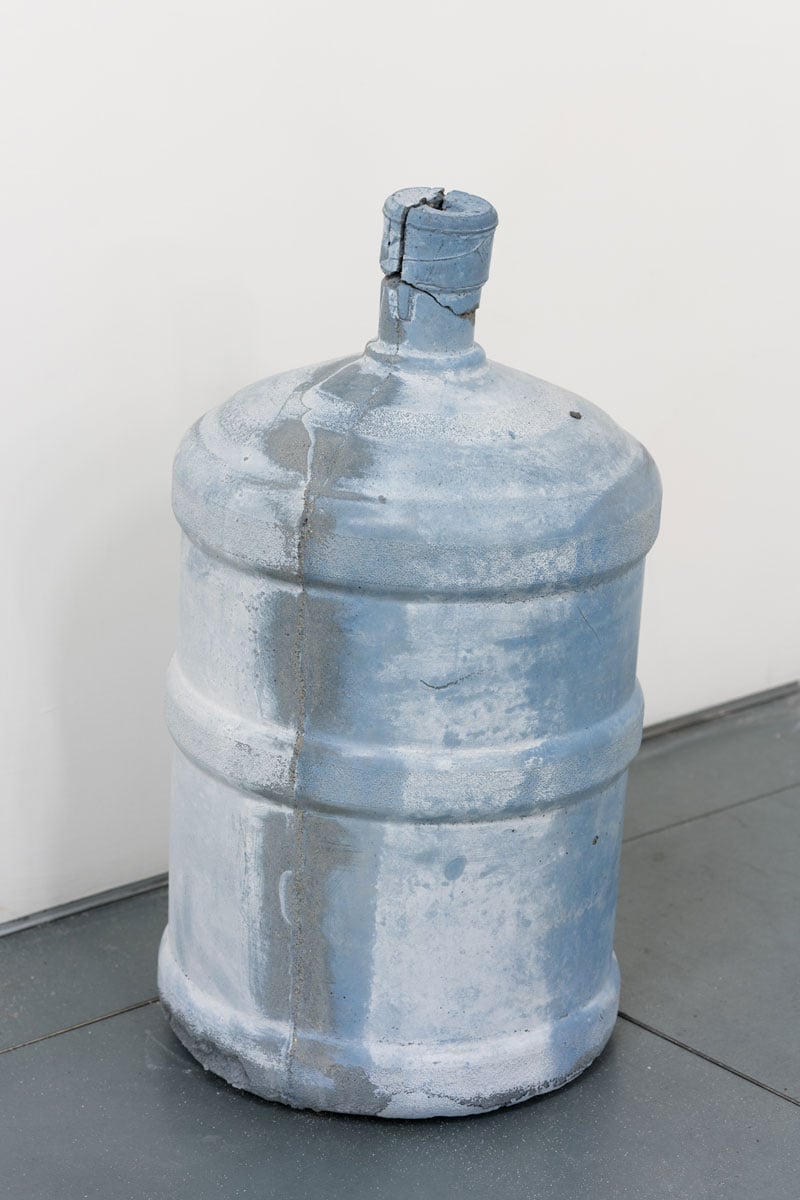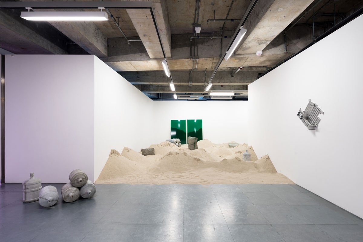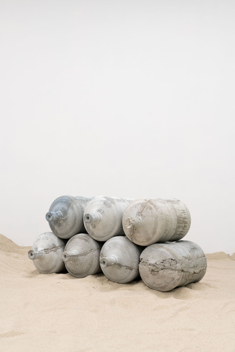 At the heart of the exhibition is its title, ‘Green Island’, which refers to a cement brand, produced in Hong Kong, yet established as a company in the early 20th century on an island brandishing the same name in Macao (Ilha Verde). Paiva uses this title as a point of departure, reflecting visually on the irony of the words in the context of the city’s framework, whilst using the material itself to mount a discourse on the urban dialectic. Channelling this are the centrally-placed sets of sculptures: casted water bottles and cement bags. Beyond their literal, medium-based association with the exhibition name, they nod to a city’s growth near water sources, its construction and social productivity. Equally, through their careful arrangement, they engage the force of gravity, the delicate balance between placement and fall, acknowledging the cycle of creation and collapse.