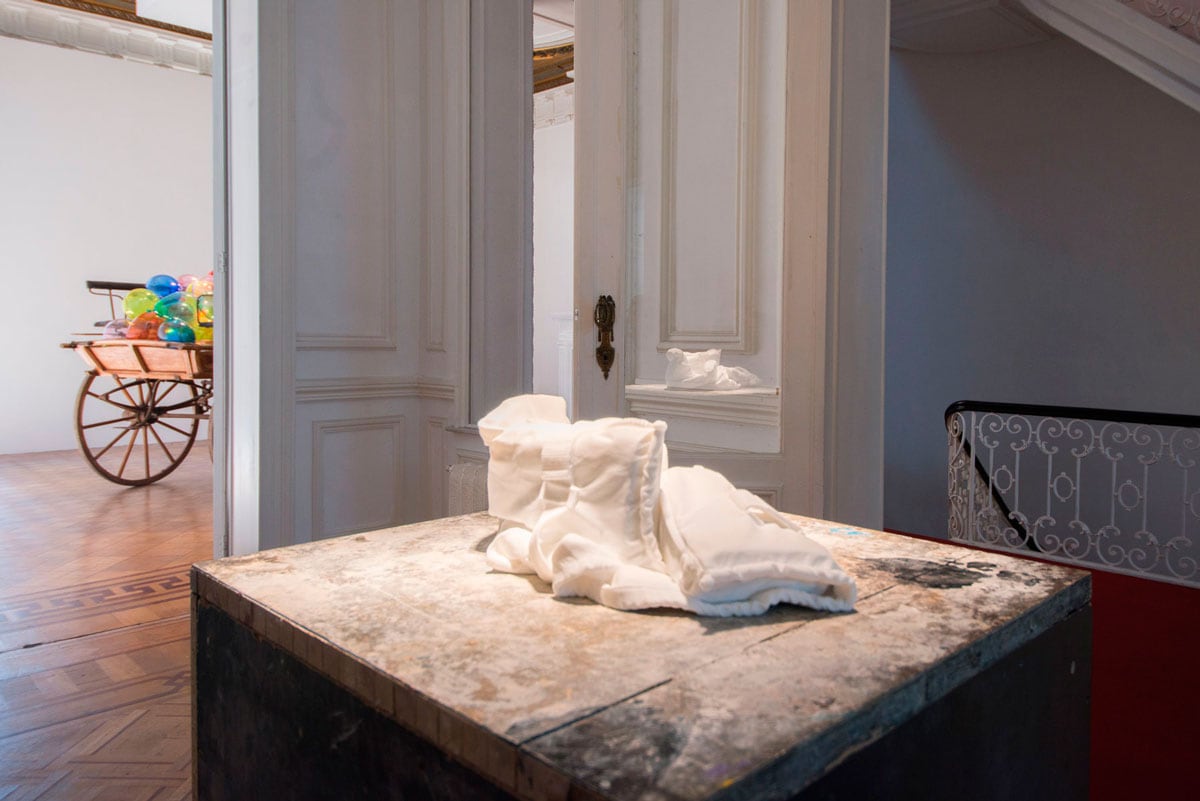 John Isaacs likes to play with old references, archaeological even, to better examine both the present and the future. Several works comment upon our desire to manage this present, and our (in)capacity to do so. The Child’s Life Jacket, carved from Carrara marble, evokes in the form of a monument or mausoleum, the thousands of refugees trying to reach European shores while oftentimes losing their own lives and those of family members in the process. “The Cyclical Development of Stasis” follows the same train of thought: this hand – like that of an ancient monumental statue, with its pointing, authoritarian finger – is presented alone within a glass display box, and isolated from its historical and symbolic context.