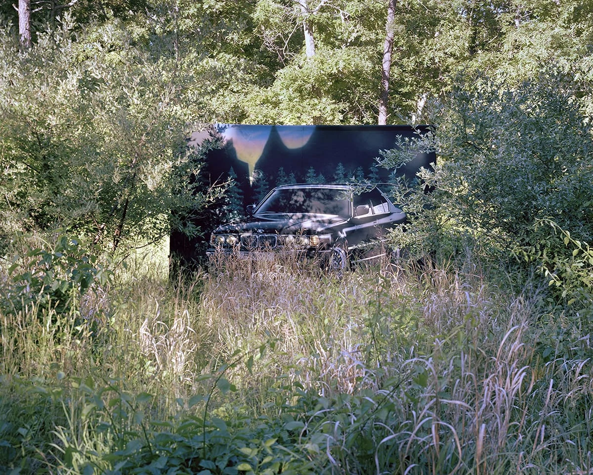 Based on his experience as a club photographer in and around Washington DC, Cook began working with backdrops used as photo backgrounds at parties, creating an aesthetic unique to the African American experience. In “Urban Landscape” (2018), the backdrops are set in landscapes and can act alone without the people that normally pose in front of them. Escapist motifs such as the Hennessy bottle, cocktails on the beach or fancy cars, which normally stage the background of a carefree night, are brought to the forefront here.