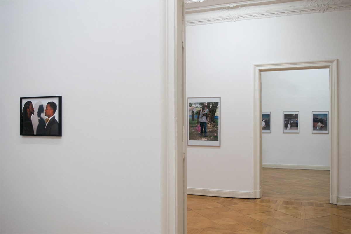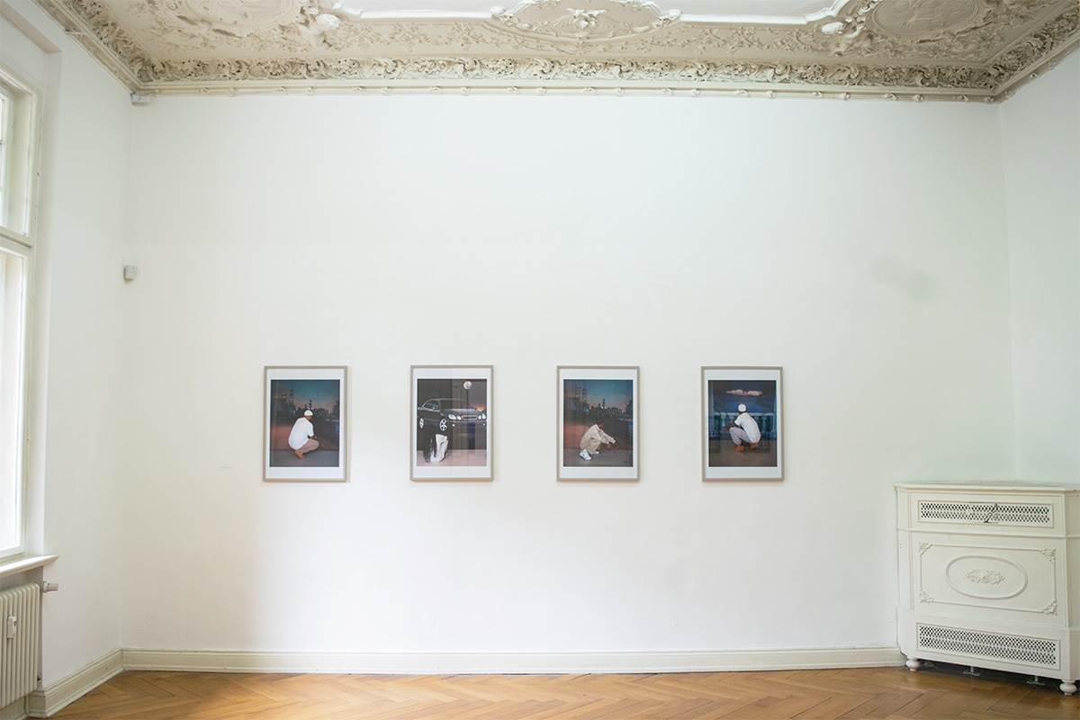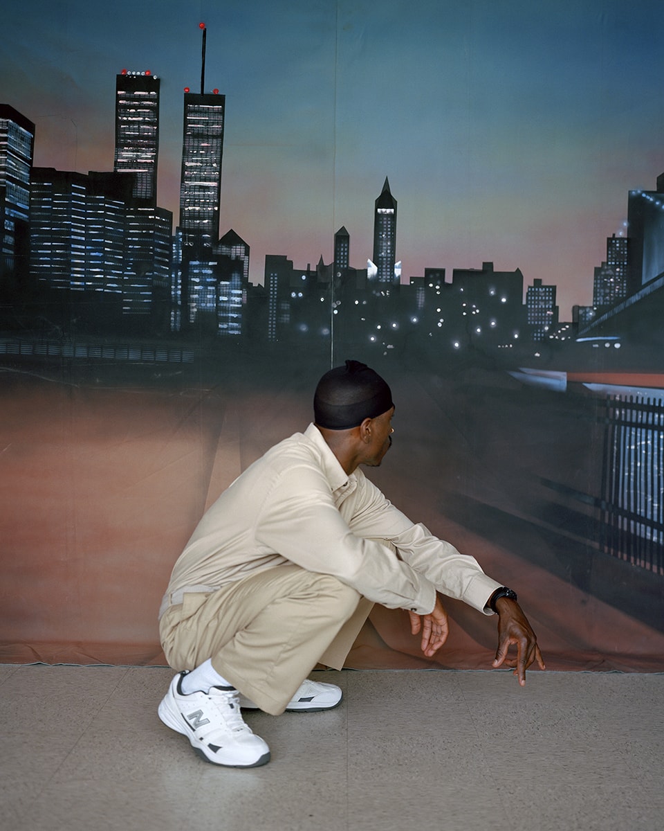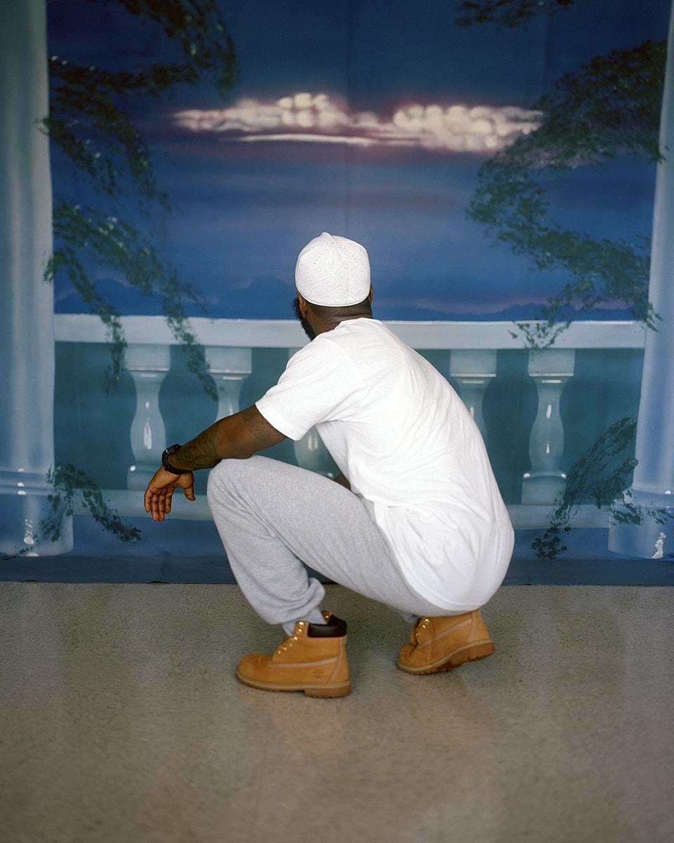 Another important inspiration for Cook is prison photography and his own collection of polaroids taken in prisons. Backdrops are also used in this practice, but with different motifs than in party photography. For “The Visiting Room” (2019) Cook photographed inmates in the visiting room in front of club backdrops. They take up the typical kneeling pose, supposed to reflect pride and masculinity, but are turned away from the viewer and thus anonymous – a tactic that allows the viewer to put himself in the figure’s position.