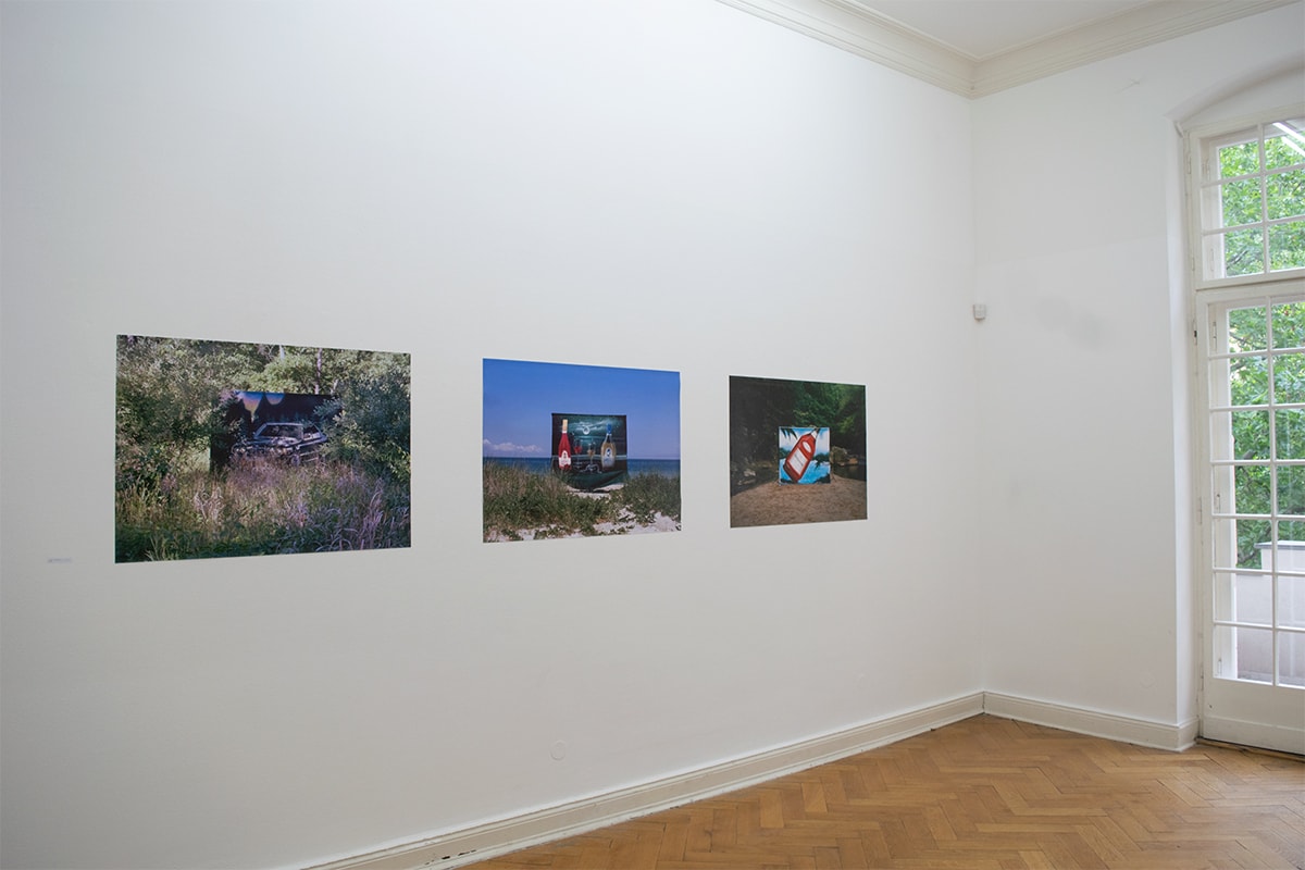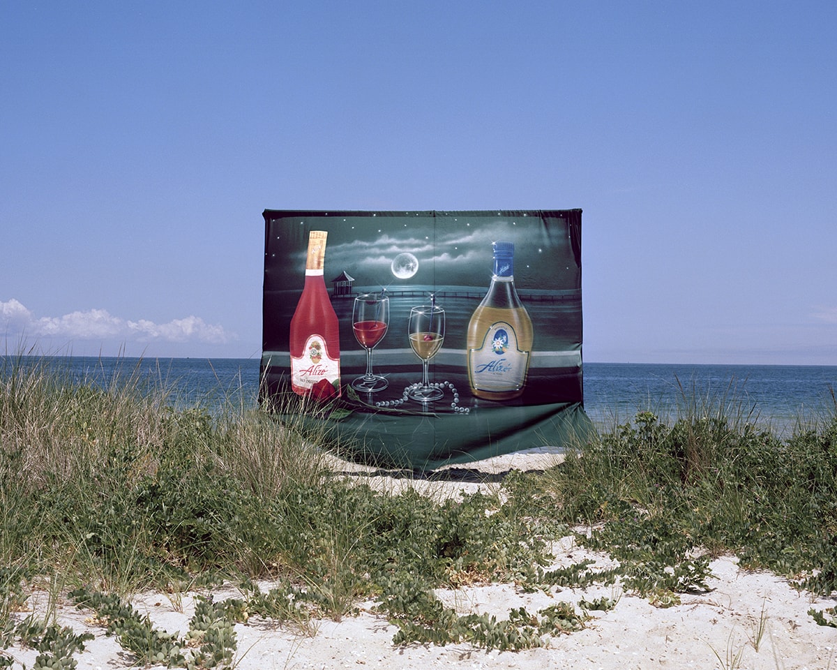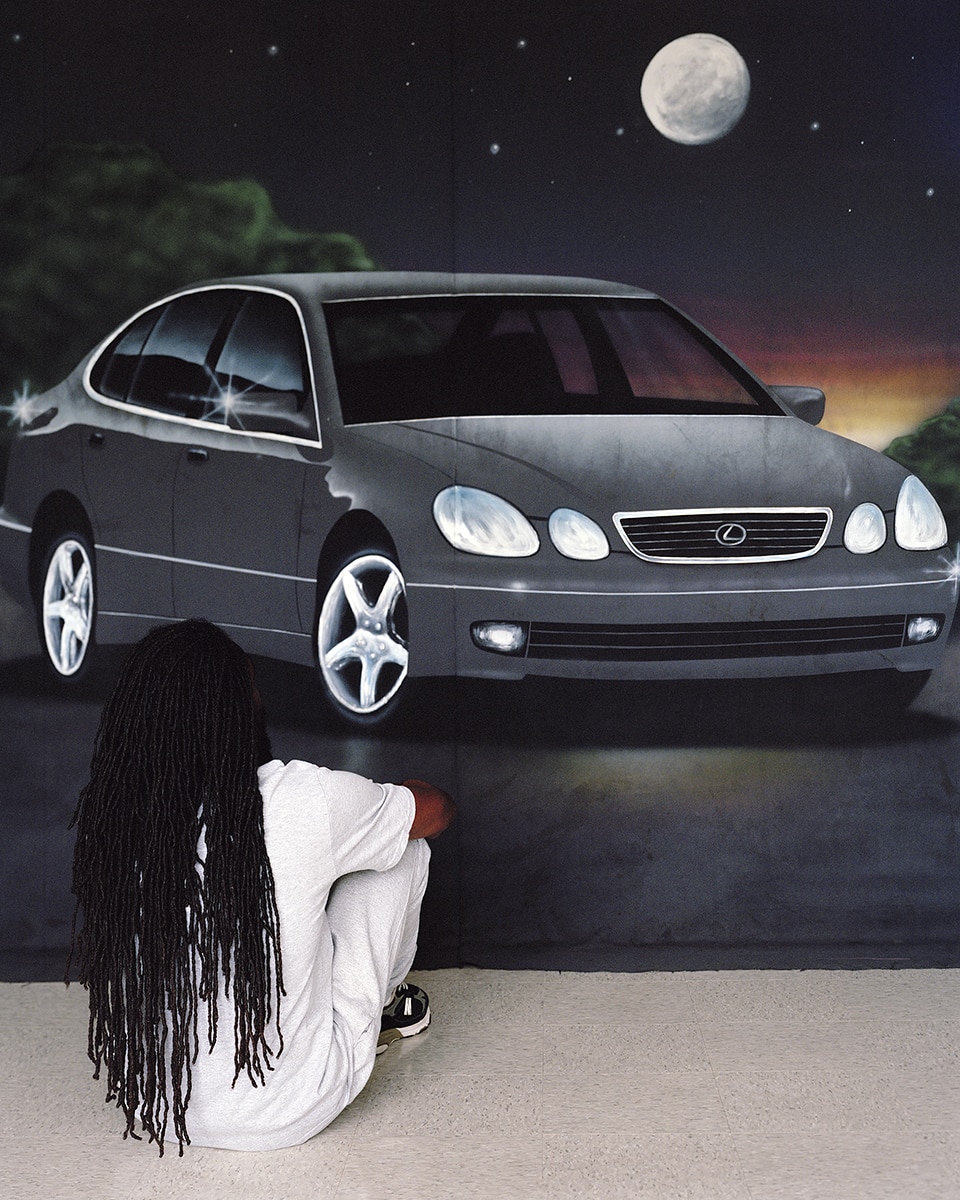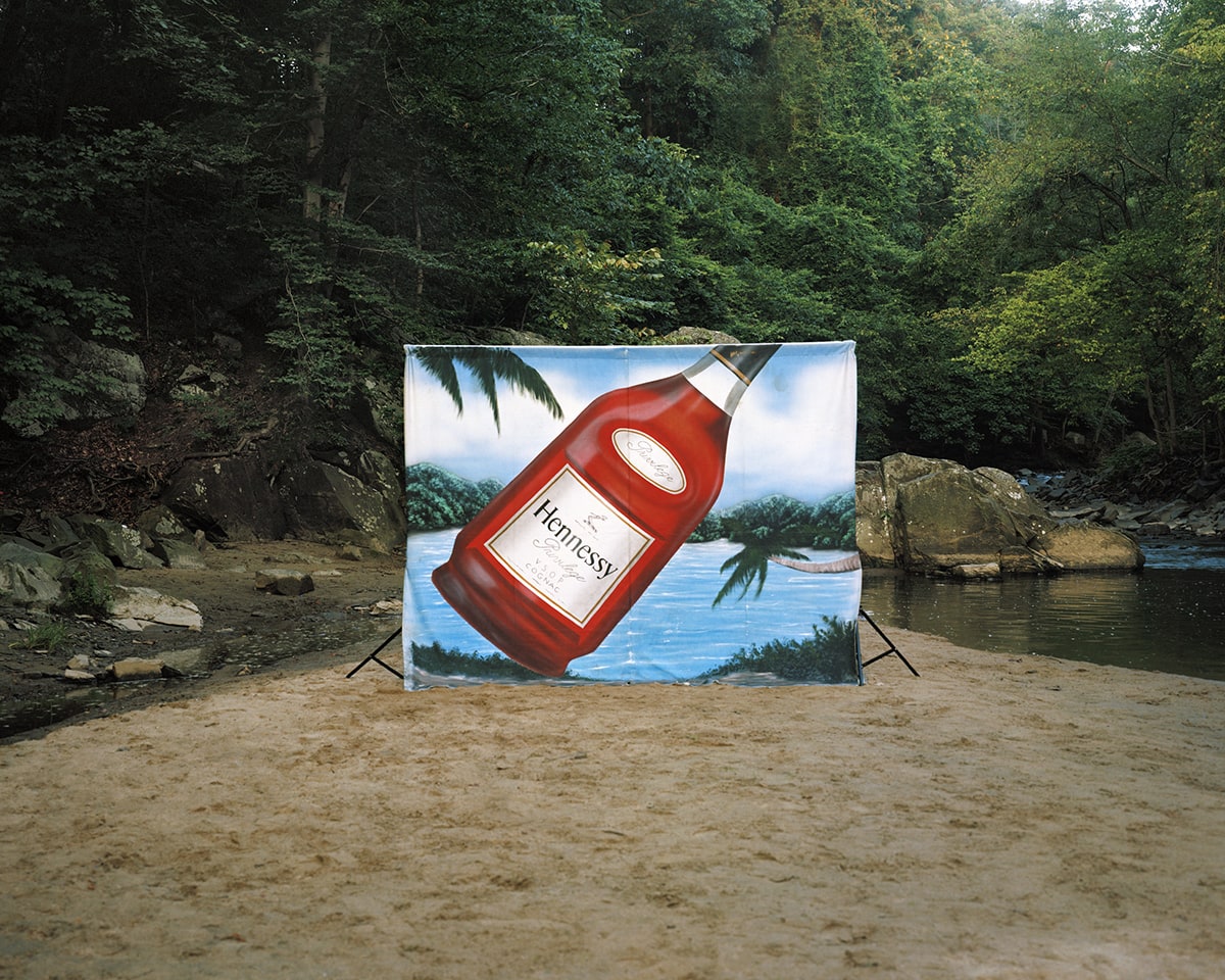 Based on his experience as a club photographer in and around Washington DC, Cook began working with backdrops used as photo backgrounds at parties, creating an aesthetic unique to the African American experience. In “Urban Landscape” (2018), the backdrops are set in landscapes and can act alone without the people that normally pose in front of them. Escapist motifs such as the Hennessy bottle, cocktails on the beach or fancy cars, which normally stage the background of a carefree night, are brought to the forefront here.