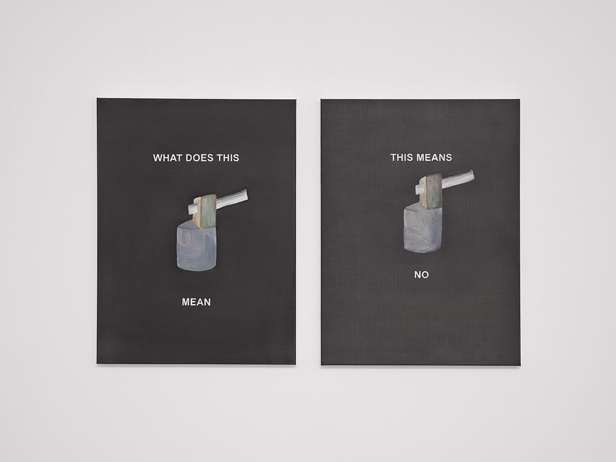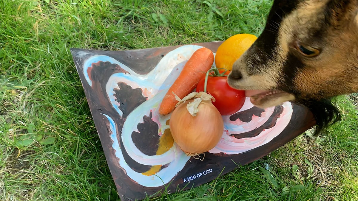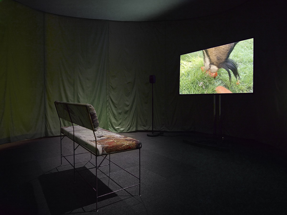 Diptych panel paintings, pitting images against text, test fluency in this new optical and oral vocabulary: flamingo = angry, bread = work and so on. They suggest that any fixed meanings generally ascribed to objects or utterances can be re-wired, re-learnt. While it might seem as though nature has taken over in the next room, thanks to the training previously provided in the exhibition, all participants should now be able to decrypt Prouvost’s codified tableaux and thus fully appreciate the significance of a chance encounter between a goat, a tree branch and a cigarette. Of course, any hieroglyphic or linguistic system is open to interpretation, misuse and bastardisation, so here too the limits of Prouvost’s imposed dialect are proven to be unstable and prone to breakdown.