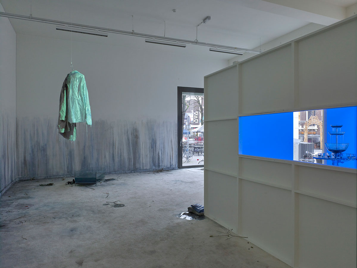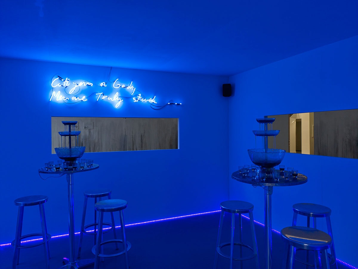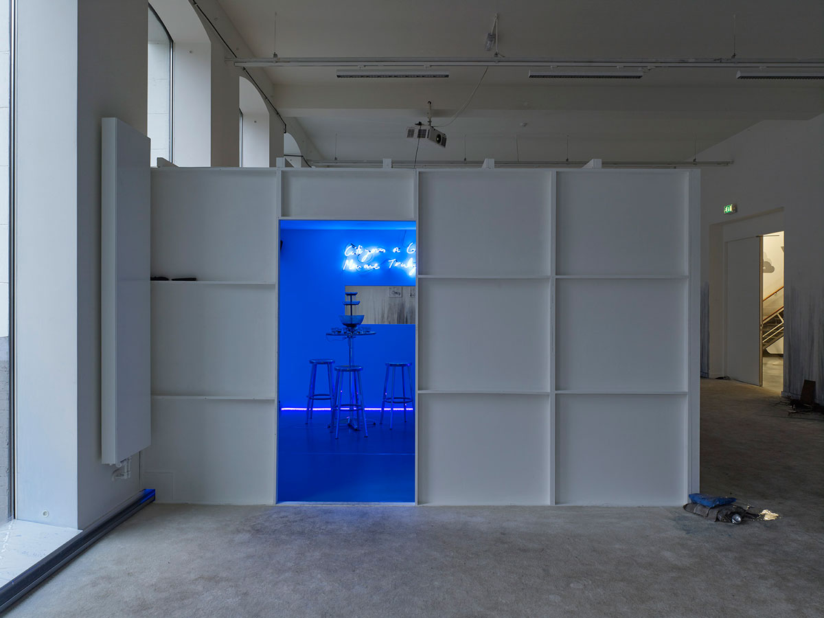 Prouvost’s installation transforms the ground floor of Witte de With into a sodden sub-aqueous bar, laced with squid ink and dotted with vodka fountains. Plays of projected light cast over objects intensify intoxicatedly as day moves to night. Combining sculpture, video and sound, the form of a mundane high street commercial space is defamiliarized and shot through with a Kafkaesque narrative overlay that metamorphoses literature into space, film into sculpture. Here language is as slippery as a squid, function as deceitful as fiction.
