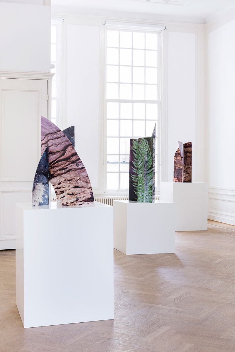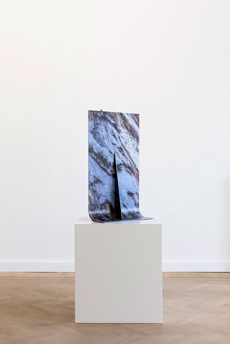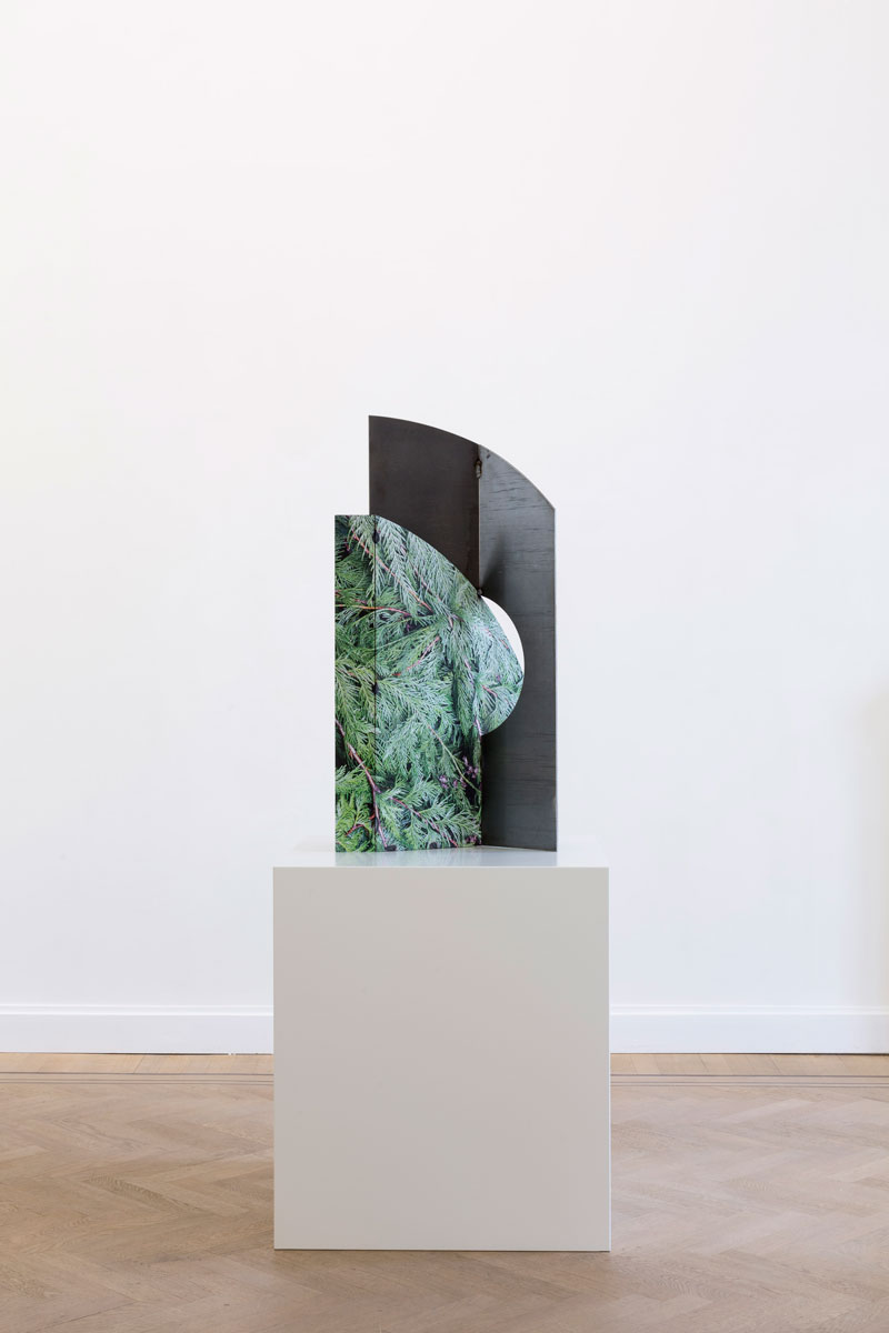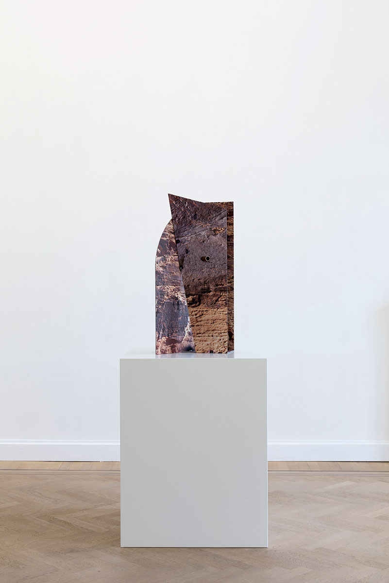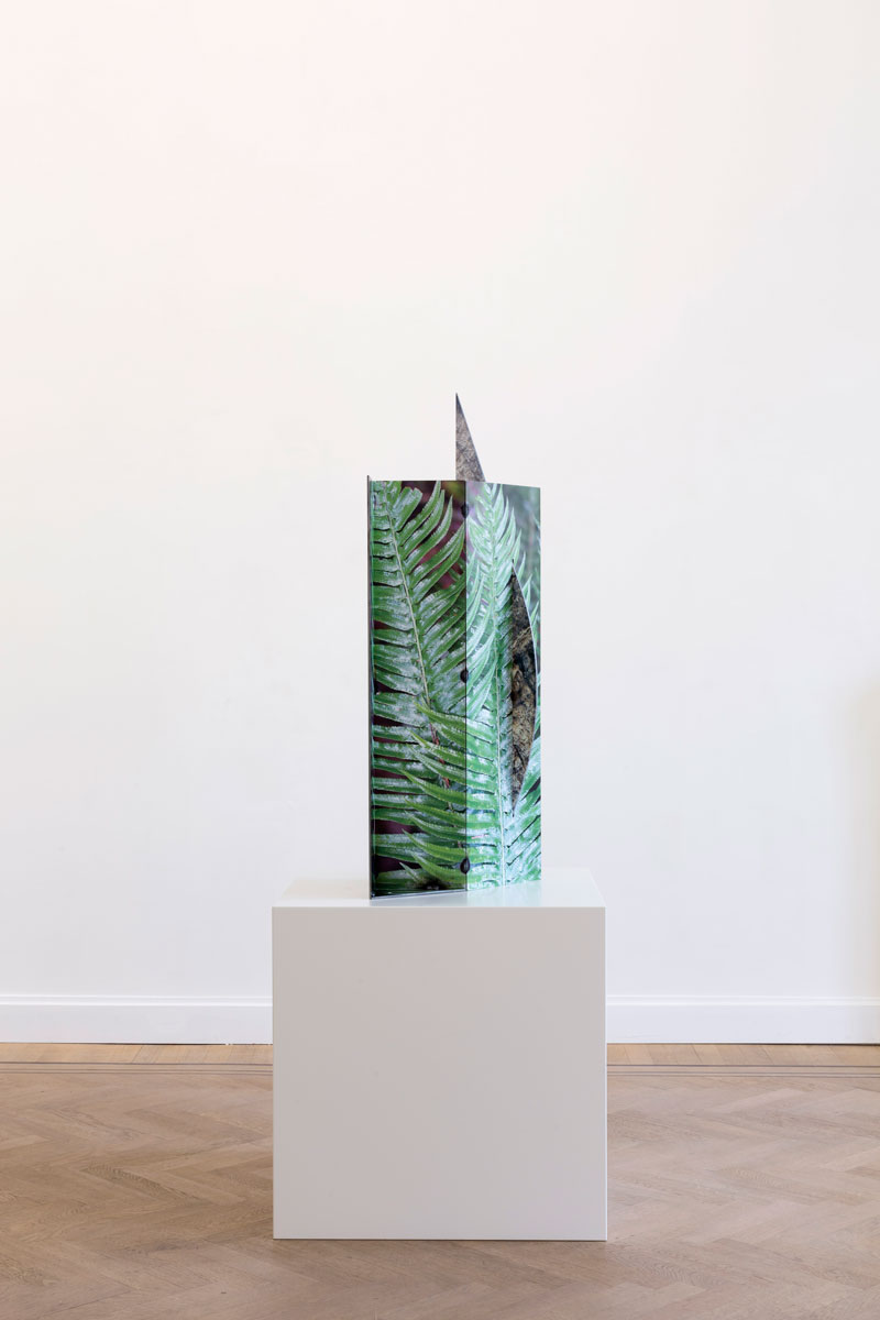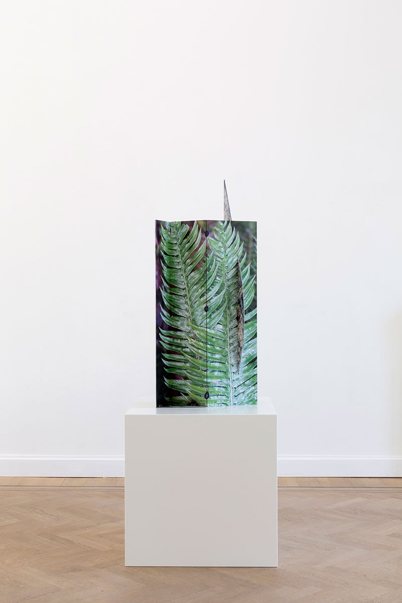 Proposing a new physical presence that has a life of its own beyond the original photograph, Wilson’s work is as much about its own material as the image that it was born from. The works in Cross Country contain photographs from sites in the American west that Wilson has recently traveled to, such as Valley of Fire State Park in Nevada and Zion National Park in Utah. Many of the photographs were taken this past winter when Wilson committed several trips exploring the environment of Nevada. The images show a variety of natural textures, from detailed, green close-ups that carefully reveal the veins of a fern or a conifer’s twigs, to majestic rock facades that reach beyond the horizon. Her exploration of this region renders a concentration of colors ranging from deep green to the brown, ochre, red and even purple hues of stone. The photographs taken on site are later manipulated in the studio and printed on Corten steel. Some sculptures fluently mirror the lines of the pictured landscape, while others contain sharp geometric forms which produce an interplay of shadow and light on the images.
