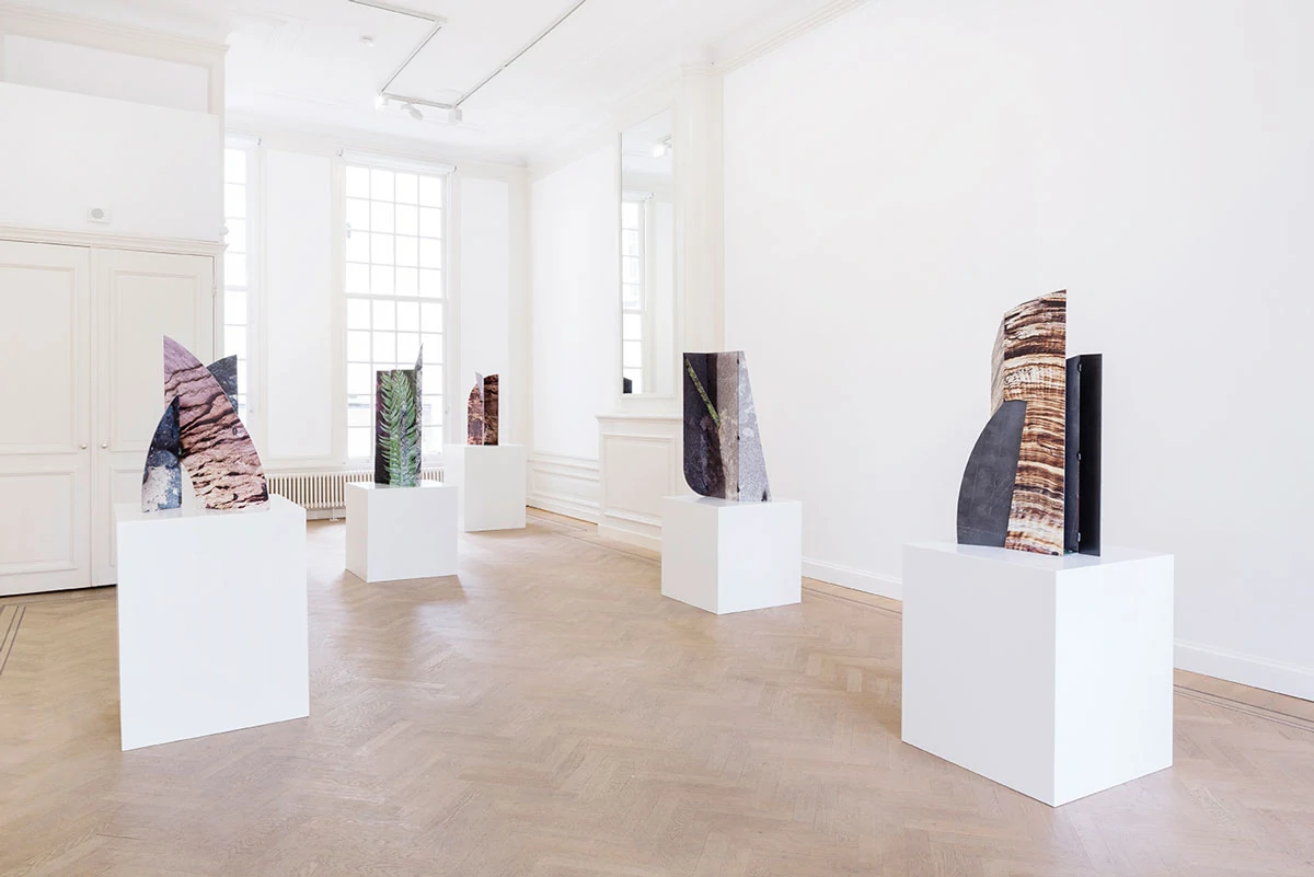 Proposing a new physical presence that has a life of its own beyond the original photograph, Wilson’s work is as much about its own material as the image that it was born from. The works in Cross Country contain photographs from sites in the American west that Wilson has recently traveled to, such as Valley of Fire State Park in Nevada and Zion National Park in Utah. Many of the photographs were taken this past winter when Wilson committed several trips exploring the environment of Nevada. The images show a variety of natural textures, from detailed, green close-ups that carefully reveal the veins of a fern or a conifer’s twigs, to majestic rock facades that reach beyond the horizon. Her exploration of this region renders a concentration of colors ranging from deep green to the brown, ochre, red and even purple hues of stone. The photographs taken on site are later manipulated in the studio and printed on Corten steel. Some sculptures fluently mirror the lines of the pictured landscape, while others contain sharp geometric forms which produce an interplay of shadow and light on the images.