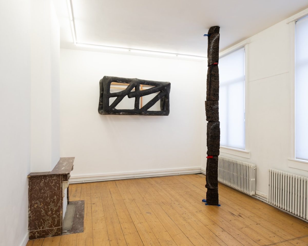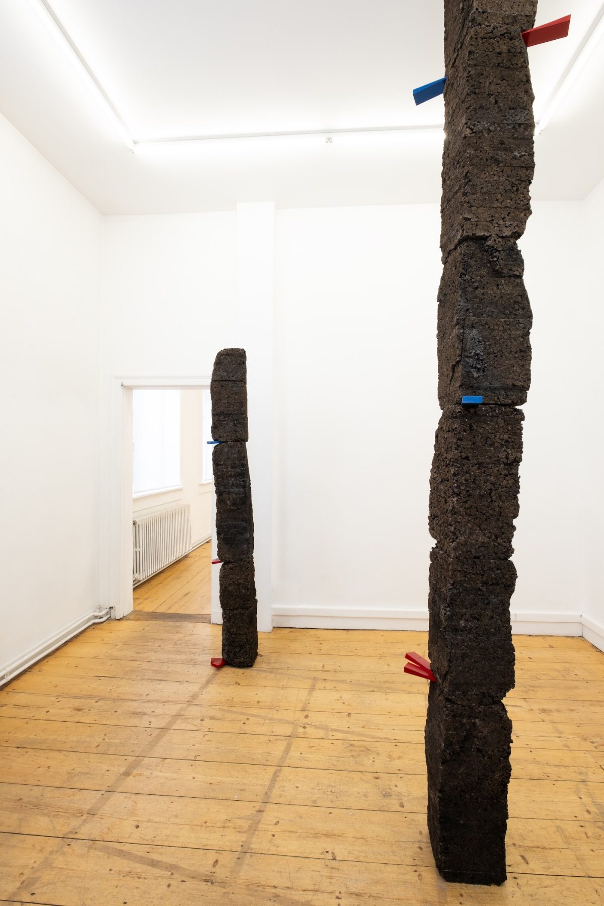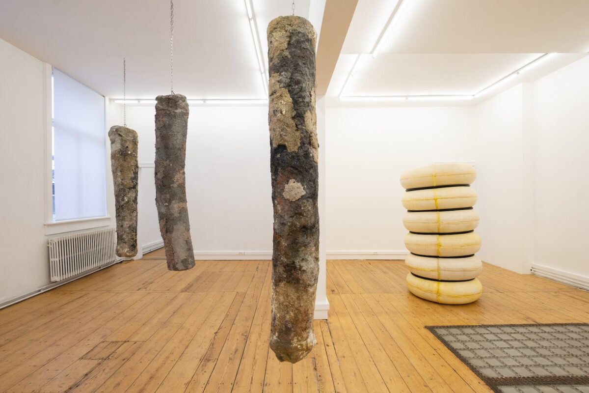 The encounter with Aydoslu’s works unfolds as a multi-layered experience. Textures and details, indicating past lives and origins, add an uncanny dimension to the familiar elements present in the sculptures. This attribute evokes a sense of intrigue and prompts contemplation about the specific histories and narratives embedded within each artwork. There are subtle remnants that hint at the possibility of enduring outdoor circumstances, adding a layer of discreet contradiction. A perfect example of this is the sculpture that gave the title of the exhibition: Helen Müllers Balcony. Floating within the walls of the gallery, it represents the “Outside”, while fundamentally altering the “Inside”.