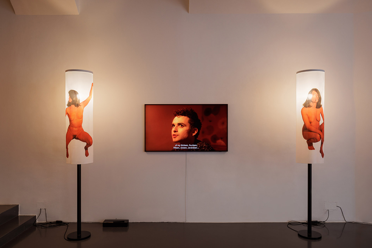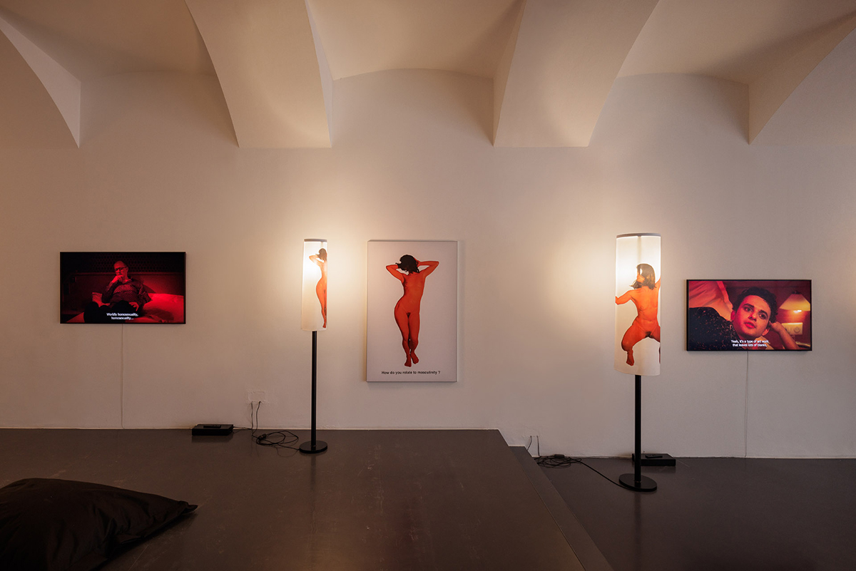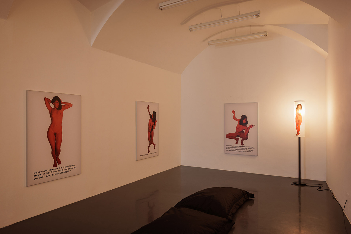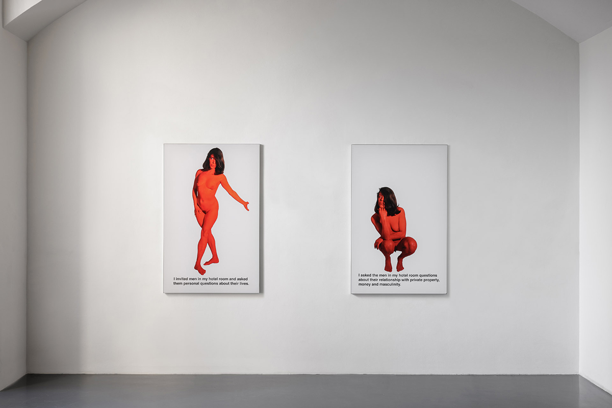 Hotel rooms are both intimate and generic spaces with practical imperatives, and Paris hotel rooms famously lack any spare space. The bed is the center piece, if not the only piece of furniture in those tiny rooms. During shooting there are a total of 5 people in the room: the interviewee, Reynaud-Dewar as the interviewer, Victor Zébo the cinematographer, Pierre Bompy who is recording the sound and Hodei Berasategi, the script assistant. The filmed subject is closely framed by Reynaud-Dewar and her team’s gaze, and is at the center of both sensual and intellectual attention. Reynaud-Dewar has explored the interview format in her previous work ‚Rome November 1st and 2nd 1975‘, where she recorded long “biographical” interviews of all of her cast (24 persons), that were transcribed and published in small individual booklets to accompany the video installation. Here, her topics of interest are still biographical, but the interviews engage in a closer look at notions of private property and masculinity. The three male voices overlap in the space and become audible only when one – in a movement similar to that of the camera in the small hotel rooms – gets closer to the screen. In the films, Reynaud-Dewar‘s questions have been edited out and thus giving an impression that these men are monologuing. These purloined questions re-appear visually, printed onto small billboards with images of the artist naked, her body colored in hues similar to that of the very artificial light used to light the hotel rooms. Thus, Reynaud-Dewar‘s questions become over-imposing, as if addressed also to the spectator of the show, and echoing in the space.