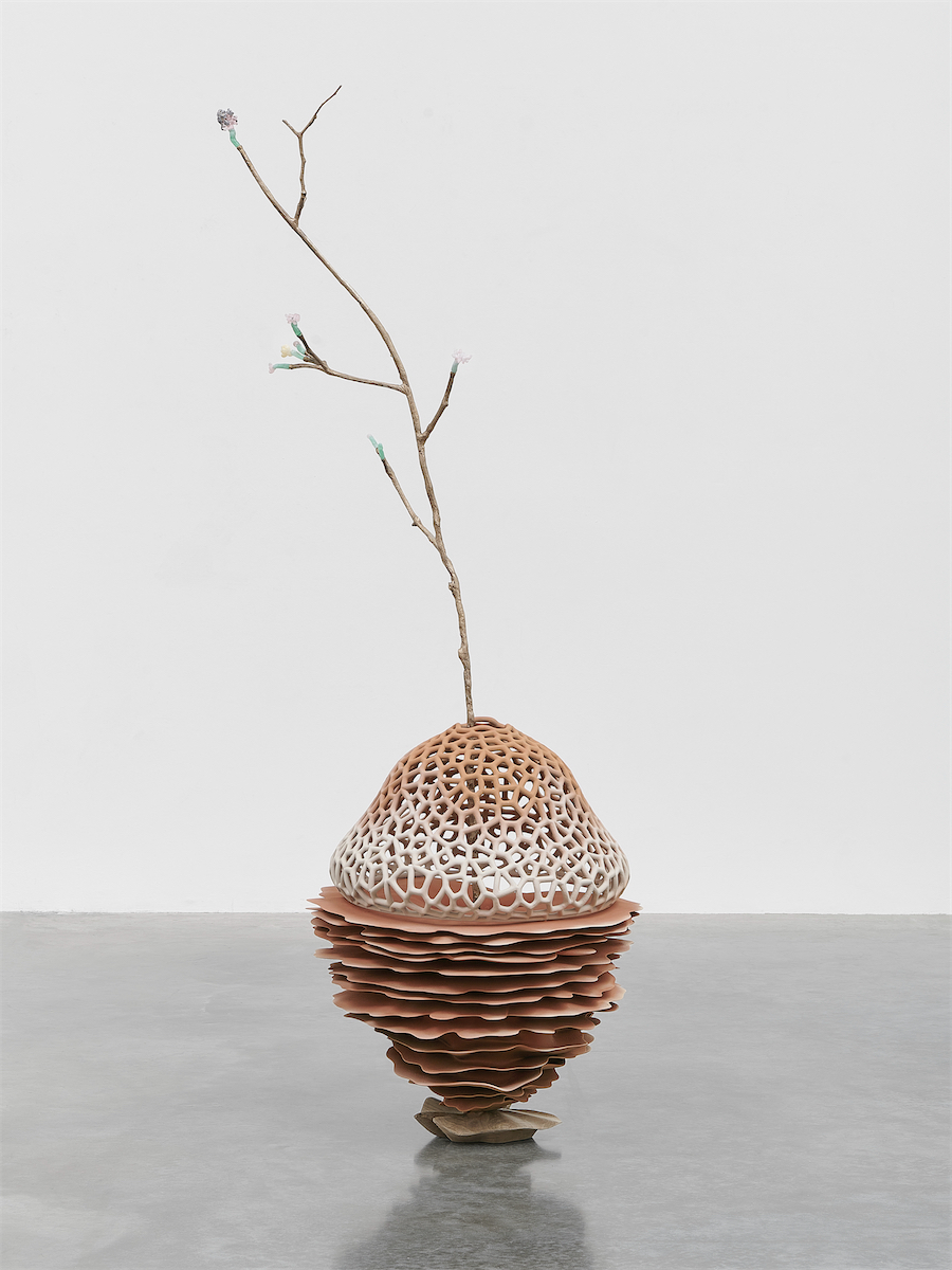 Terracotta, pigments, 150-year-old walnut (cause of death: unknown), handblown glass, culture of termite mushroom (Termitomyces) and bronze