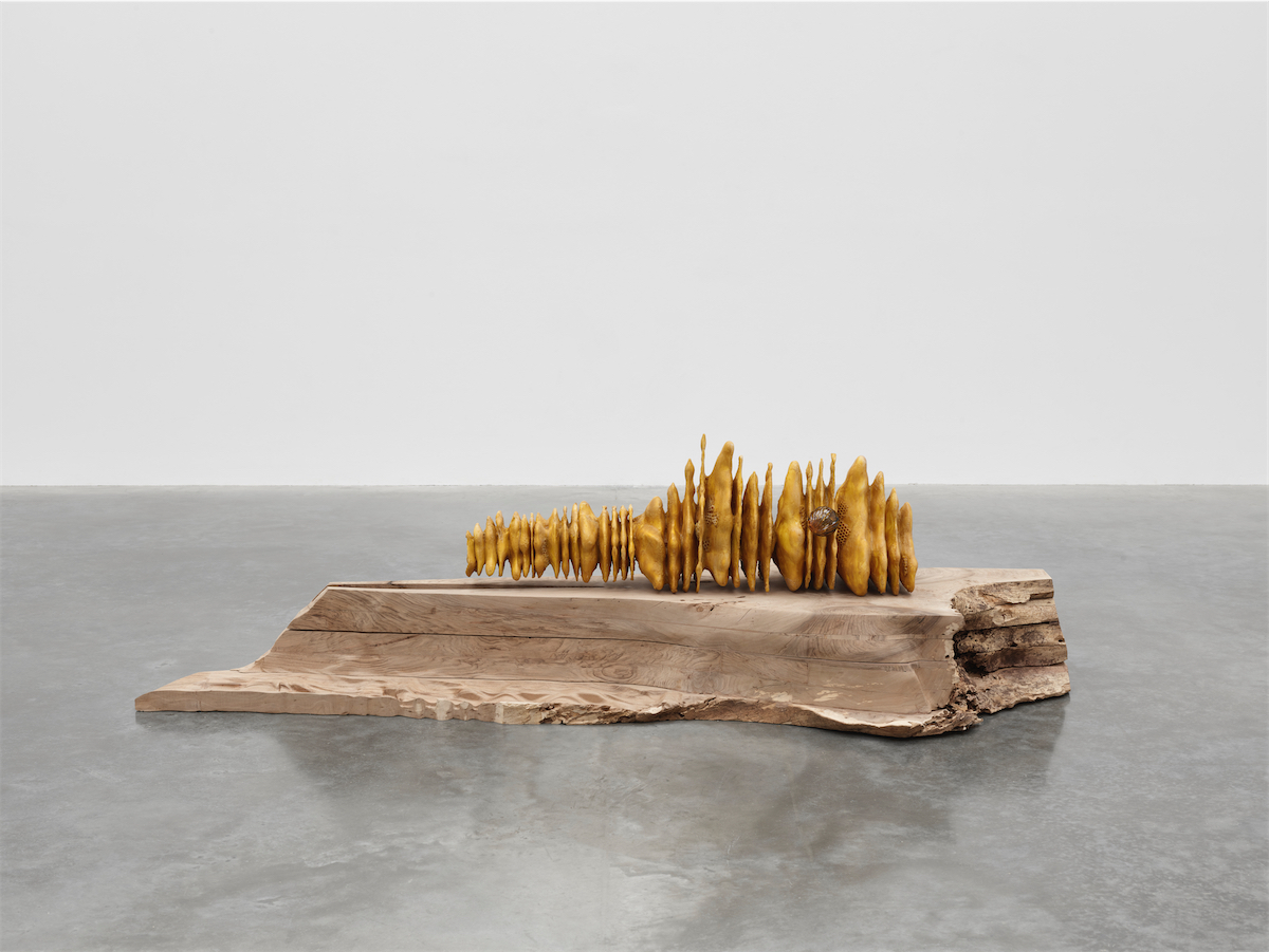 They are assembled from component parts of adobe, bronze, natural beeswax, handblown glass, and wood eaten by fungi and worms, and we sense that they may have just come together, and perhaps could recombine in other ways. Natural states of flux and change are implied not only by forms that ripple and flow, but in the suggestion of growth by replication and division, and by the impression that one part might be generating and nourishing another, as fungus flourishes from rotting wood. Sensuous materiality creates connective threads throughout the show, as the yellow glazed bricks of the mural are here picked up in the warm yellow beeswax and amber glass. The tactile, inviting surfaces are rich with incident created by woodgrain and pigments that seep and bloom like mildew. The exhibition is in one sense a celebration of human craft and industry, of mastery of diverse materials by an industrious collective. It reveals at the same time how close the sculptural process sits to the language of nature, whether building in layers of wax that accumulate like rings of tree growth or casting from a mold as when splitting the husks of chestnut to reveal the smooth, perfectly-fitting conker.