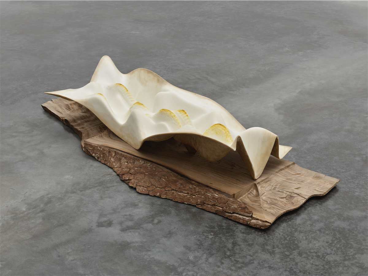 is spalted, meaning patterned with the traces of fungal infection, or burled, a wood grain formed in response to trauma; both distinctive traces which are evidence of the power of regeneration. These function as an interface that allows the visitor to participate in this collective happening, invited to recline and join in a state of disequilibrium and striving for balance.