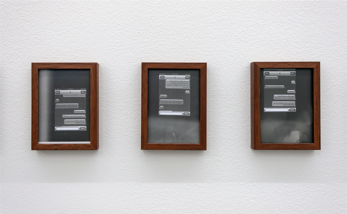 Series of 32 screen shots of a staged conversation on an iPhone, transformed into black and zhite photographs developed in a dark room, framed, 18 x 13 cm (each)
