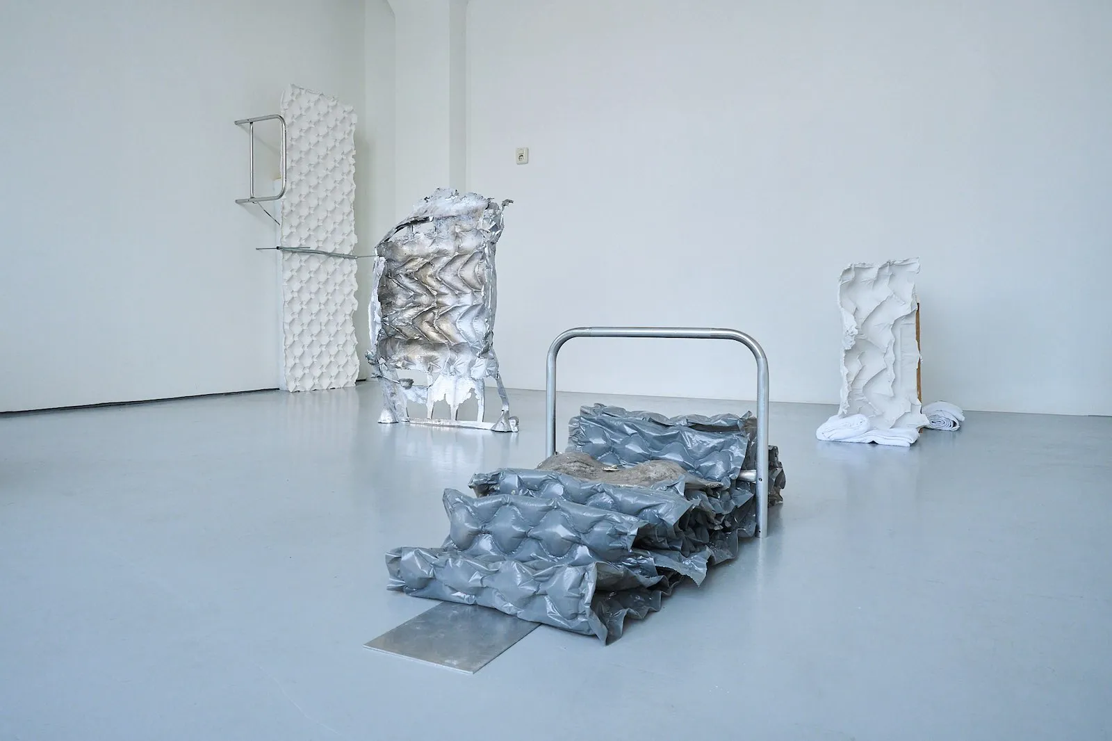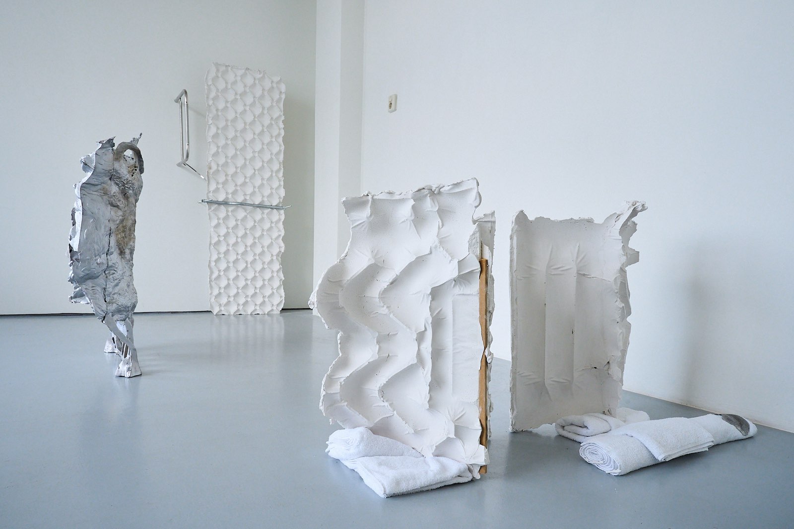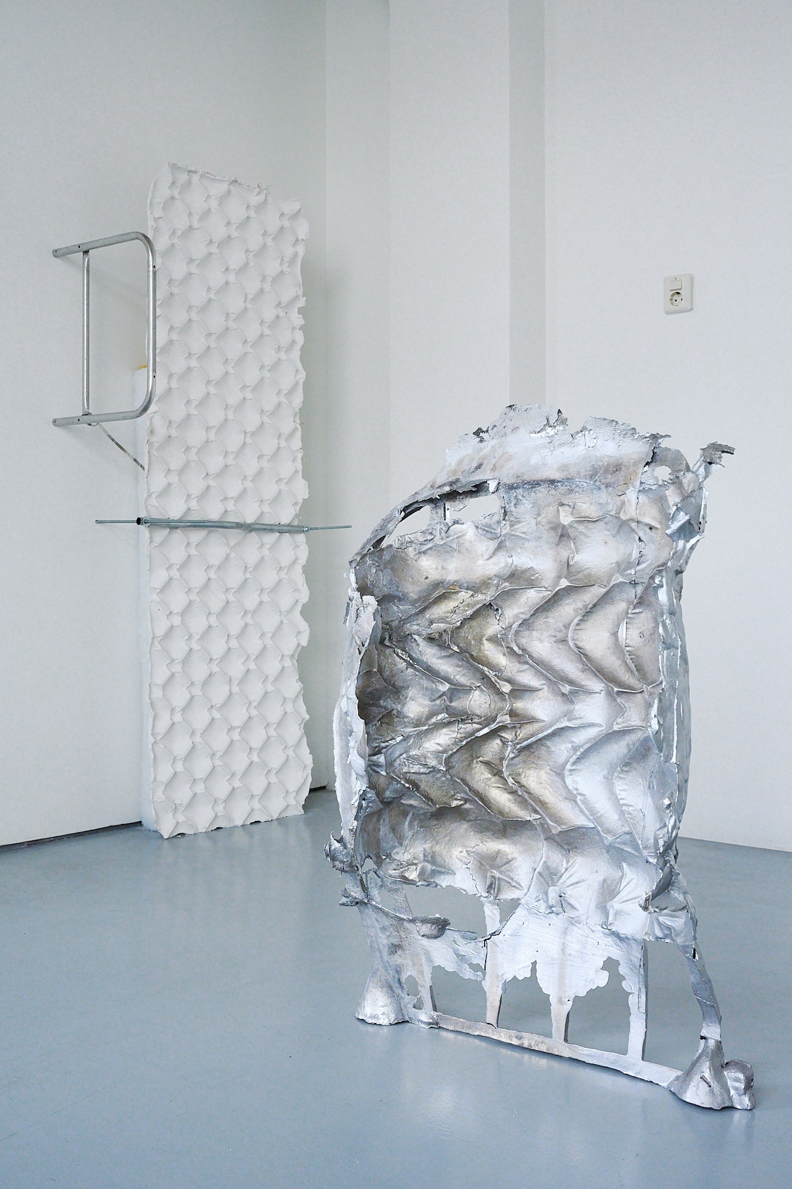 The matrasses, rolled up to fit a wooden support structure to contain their form, are casted in order to present their inside surface as a shape and as a space: in between the mattress and the body that lies on it; folding and unfolding, air moving in and moving out.