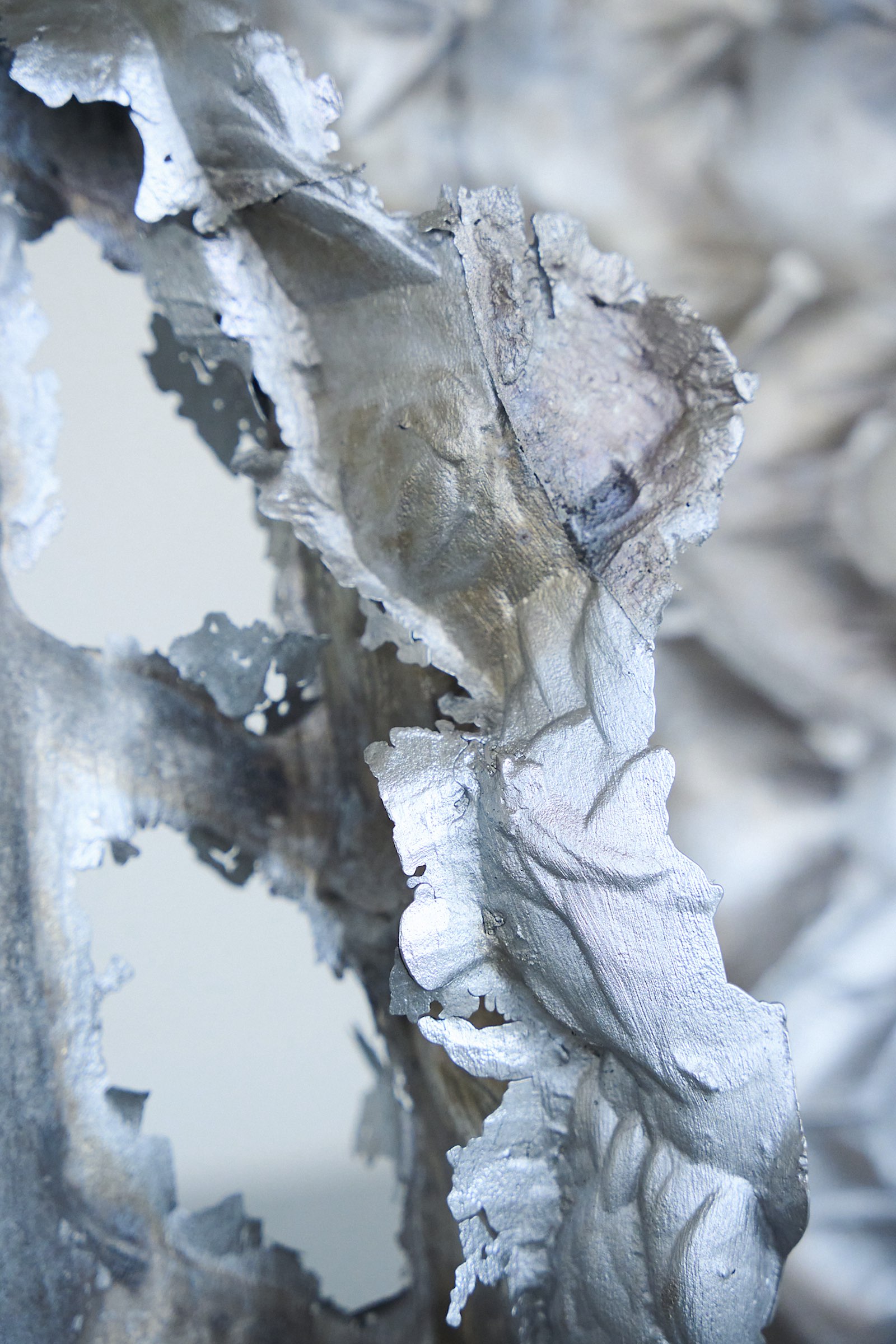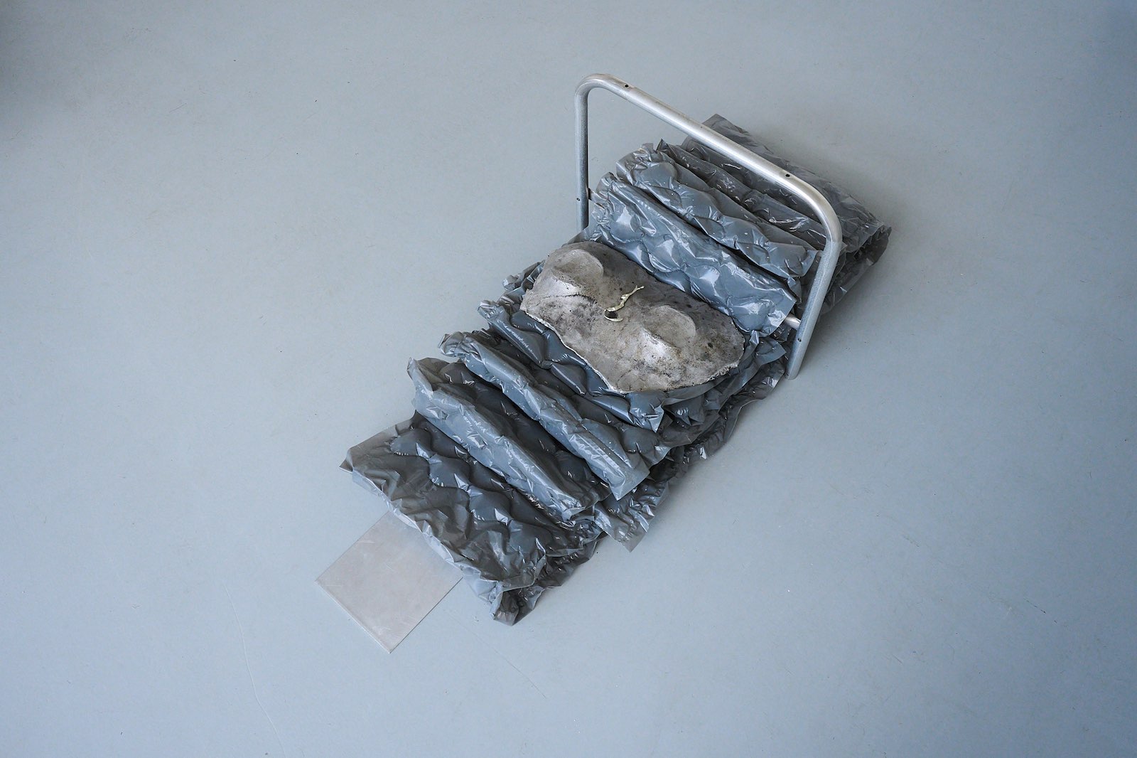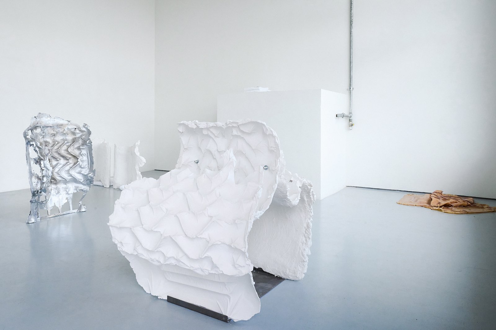 The matrasses, rolled up to fit a wooden support structure to contain their form, are casted in order to present their inside surface as a shape and as a space: in between the mattress and the body that lies on it; folding and unfolding, air moving in and moving out.