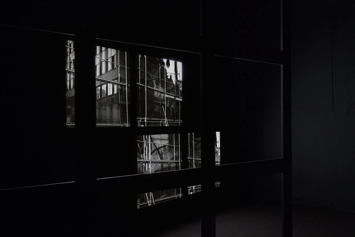 The exhibition is comprised of a 16 mm film loop that centres around an elusive object – a reconstruction of a 17th-century geometrical sundial – and a photo series depicting the building of the Ministry of Finance being demolished. The grid – one of the favorite motives of modernist architecture – is abstracted from the photo series and transferred to the exhibition space. This “formalisation” of the EKKM’s post-industrial space in turn reflects the attempt depicted in the film of domesticating and rationalising a natural phenomenon through geometry.