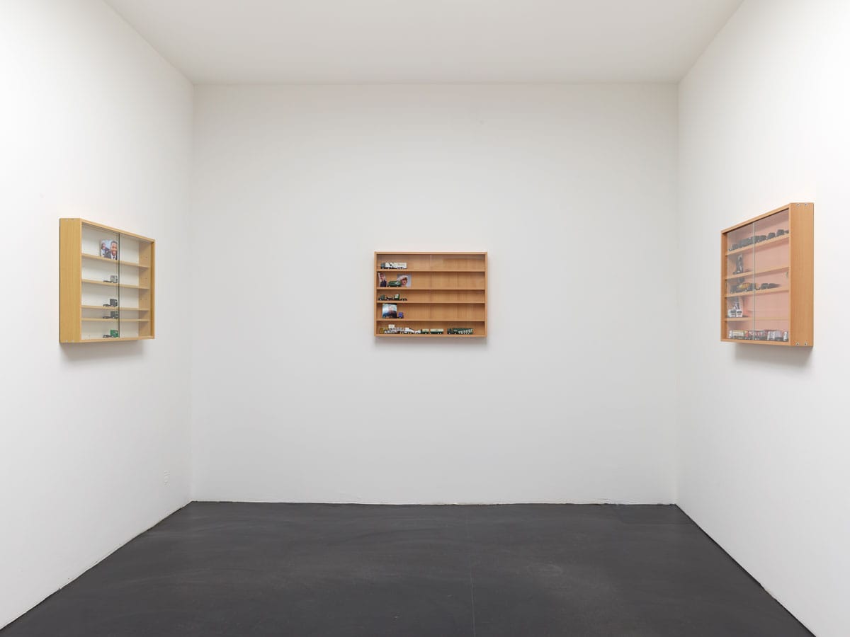 While the absence of the protagonists in these two works becomes apparent precisely through the staged and spatially clearly defined settings, in the last room we encounter a compilation of international pop stars, actors, musicians, models, writers, recorded at the peak of their careers, in their early years. The artist has taken them from her own biography, projections and longings and embedded them in the environment of commercially available pressboard vitrines full of German advertising toy trucks, with which they merge into an inseparable unity.
