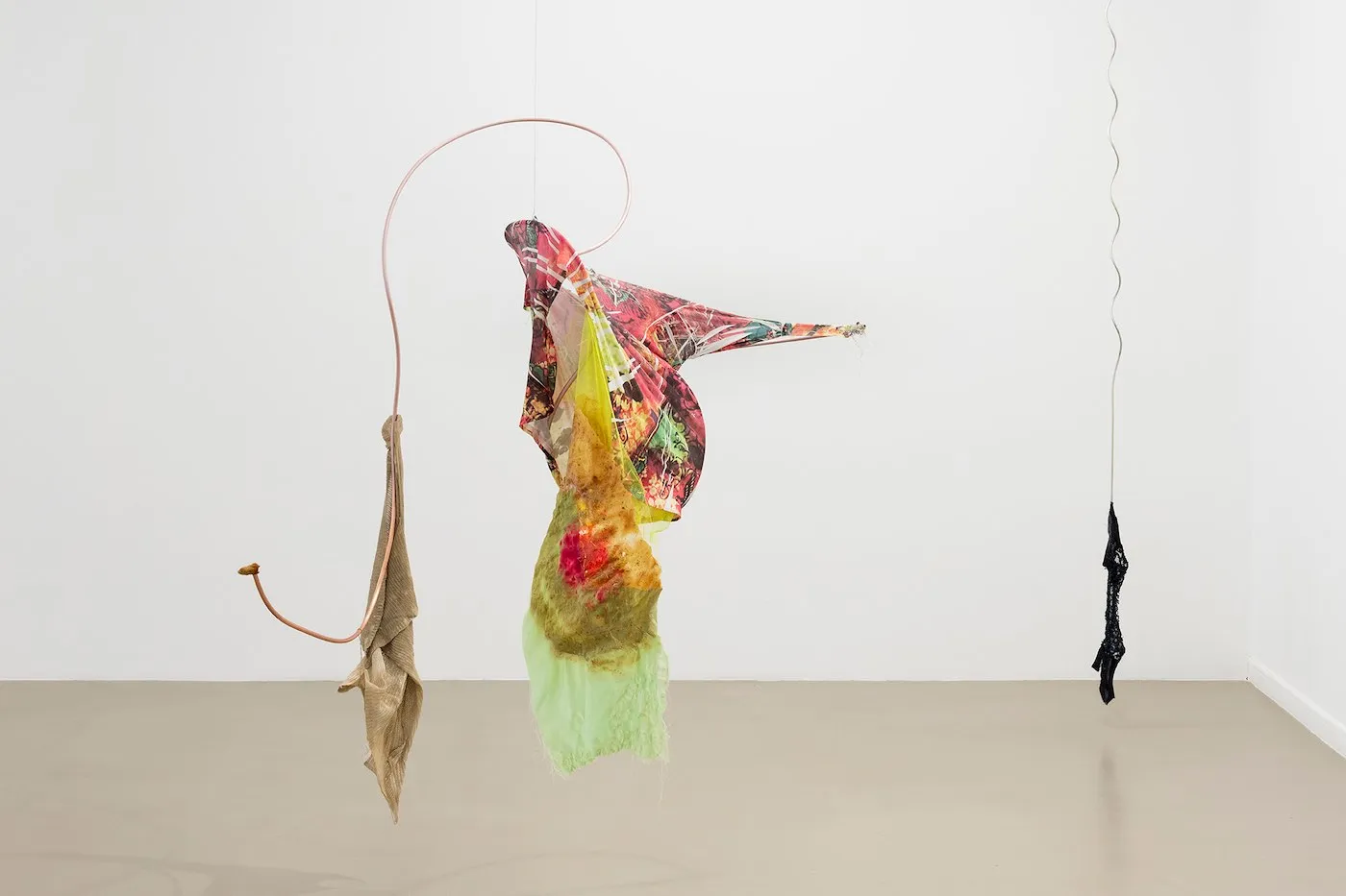 This is evidenced in Tharrats’ interdisciplinary approach, which explores the possibilities of materials on both a physical and subtle levels by bridging the realms of fashion and visual arts. Take, for instance, the copper, cotton, and other organic fibers that form the backbone of this new sculptural series. Crafted from layers of woven and printed cloth, and sometimes including elements like stones and sponges, each sculpture is meticulously stitched and woven together. Consider the role of the cotton plant in this endeavor, its growth supported by the mycorrhizal networks, its fibers eventually harvested and transformed into fabric. These fabrics incorporate homemade bioplastics and SCOBY—a symbiotic culture of bacteria and yeast used in the production of the widely beneficial kombucha drink—which Tharrats produces to highlight the potential of these materials in addressing our planet’s most pressing environmental challenges.