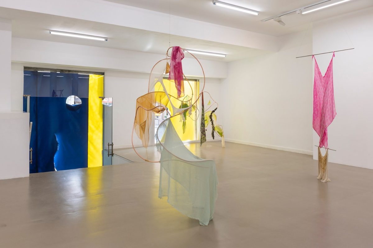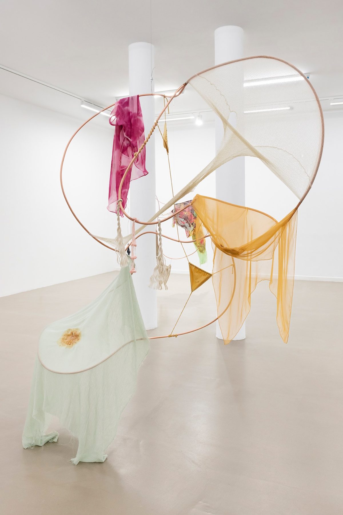 As part of REFUGIA’s public program, which will take place on selected weekends throughout the duration of the exhibition, Tharrats invites the public to activate the sculptures through breathing, laughter, and collective singing. Another performative ritual will activate AVOC IVIDRAM (2024) a large-scale garment that dresses the gallery façade inspired in the Tibetan Buddhist Thangka paintings on cotton and silk appliqué, usually depicting a deity, scene, or mandala. Traditionally kept unframed and rolled up when not on display, thangkas are mounted on a textile backing in the style of a scroll. In the gallery, the spirulina dyed fabrics—a blue-green algae believed to be one of the oldest life forms on Earth—are held by delicate copper tubes and revert not to a deity but to the artist’s belief in the inherent divinity of the sea and the forest. The process of care and collective unfolding of this scroll mirrors Tharrats’ exploration of interconnectedness and shared experience.