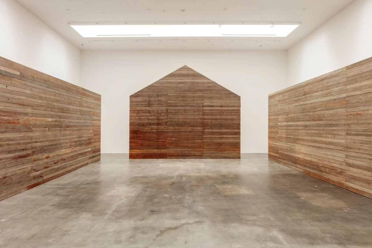 Immediately upon entering the main gallery, viewers encounter ”Every spirit builds itself a house, and beyond its house a world…Build therefore your own world,” 2017, an architectural structure based on the first houses built by and for the first free and emancipated Africans in Revolutionary Massachusetts. The horizontal boards that make up the walls of the deconstructed “home” become like lined paper, with texts painted directly on the inside walls by prominent, contemporary African American writers and poets: Tisa Bryant, Danielle Legros Georges, Robin Coste Lewis, and Kevin Young.