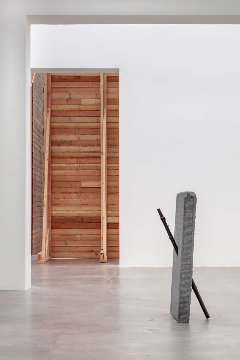 Immediately upon entering the main gallery, viewers encounter ”Every spirit builds itself a house, and beyond its house a world…Build therefore your own world,” 2017, an architectural structure based on the first houses built by and for the first free and emancipated Africans in Revolutionary Massachusetts. The horizontal boards that make up the walls of the deconstructed “home” become like lined paper, with texts painted directly on the inside walls by prominent, contemporary African American writers and poets: Tisa Bryant, Danielle Legros Georges, Robin Coste Lewis, and Kevin Young.