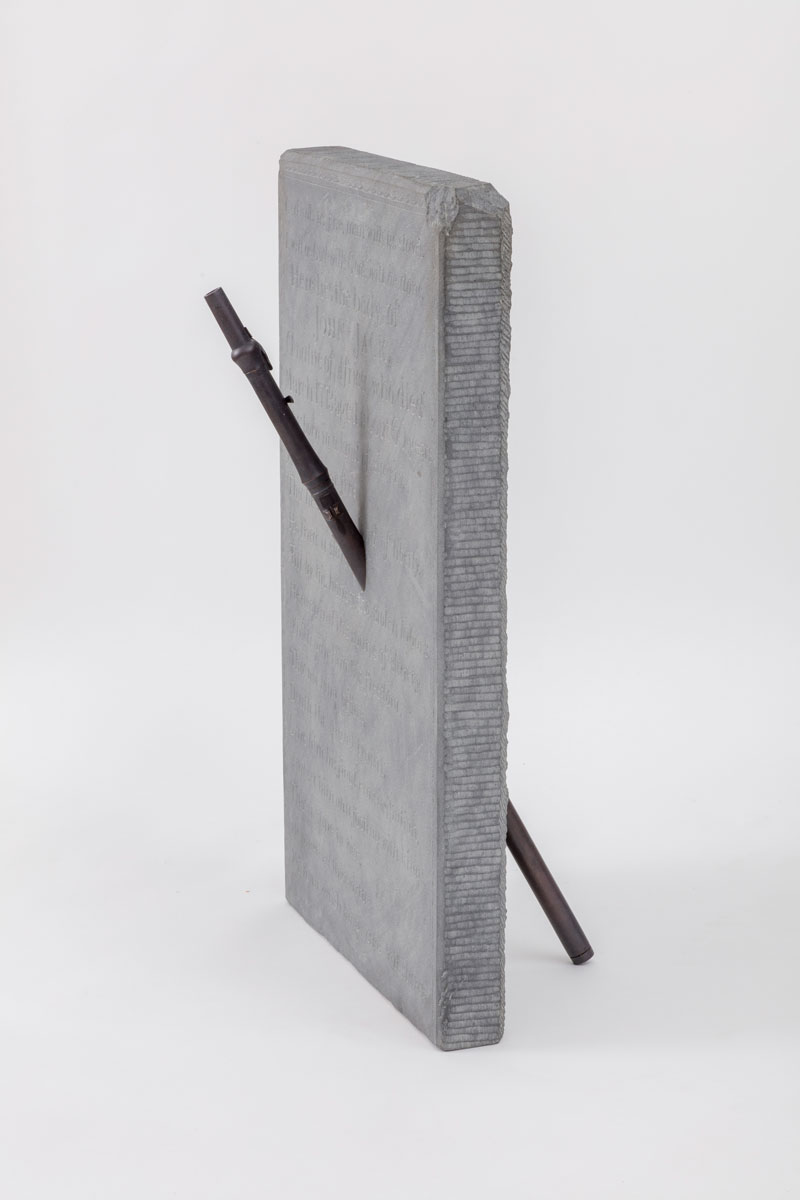 In addition to this reinterpreted hybrid “historical house” centerpiece, other artworks on view include sculptures that integrate artifacts related to African Americans in Colonial America and the notable transcendentalist writers and thinkers of pre- and post-Revolutionary Concord. Using precise 3-D renderings of original objects, the composite sculptures signify a fundamental interdependence of influences in the creation of American culture and identity. Works include a wooden mash-up of Phillis Wheatleyʼs writing desk with Ralph Waldo Emersonʼs writing chair; a bronze cast of Jack Garrisonʼs walking stick intersected by Henry David Thoreauʼs pencil; and the headstone of an enslaved man named John Jack crosscut by Thoreauʼs flute. The headstone bears a remarkable epitaph revealing the contradiction of the American revolutionary call for freedom and liberty while upholding and profiting from slavery. The artist has also forged a billy club of carbon steel – these often used by African American self-defense groups and their white comrades in battling bounty hunters who came to Boston to hunt fugitive slaves after the Fugitive Slave Act was passed in the 1850s. The African American defenders never carried lethal weapons – the billy club is symbolic of their courage and conviction not to kill.