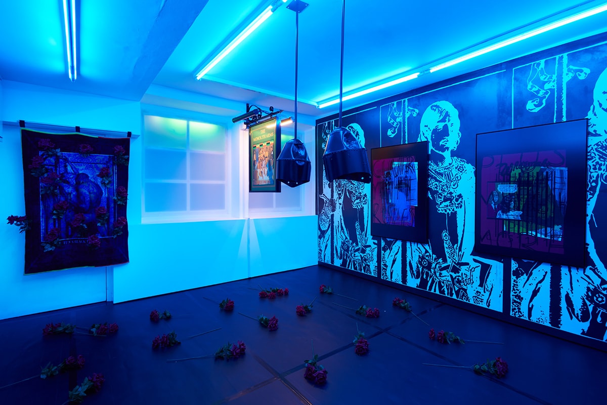 The installation elements, which surround the works in the exhibition, feature artefacts and images borrowed from both British folklore and black political resistance, and function as a way of understanding the often complex and ambivalent nature of belonging and subjectivity. These elements are interspersed with a series of collages constructed from the artist’s own personal archive of ephemera. Essential to the artist’s practice, this process of collecting, manipulating and reconfiguring these sources allows him to unpack their relation to his personal history as well as understanding their wider impact on the present. The artist states that “Being a working class, black northern male with roots in Carriacou….yes of course these markers have cultural resonance… I guess what my own archive has allowed me, in a way, is to complicate and curate these points of identification.”