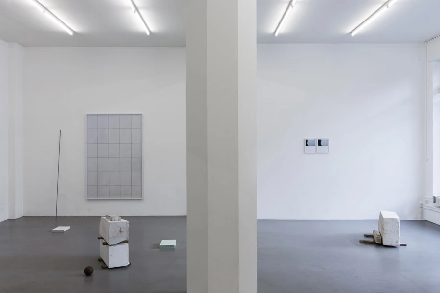 In the room there is a large-scale framed photograph installed. The image consists of a thinly delineated grid made of squares, each the size of a household napkin. The pale empty fields (hinting at an explorer’s cartographic map) speak a language of minimalistic nature; at the same time the photograph exemplifies Cramer’s methodology, with a toned down, reflected and distant demeanor he portrays the magnitude of the sea, the vastness of the oceans and humanity’s efforts in trying to read these surfaces. On the gallery floor, blocks of white marble are stacked on top of each other. The stone plates, with their thin and organic black lines running through them, communicate to the print across the room. Yet they present a more raw portrait of our land. Imbedded in the landscape they were carved out and now, unpolished and unworked, insist on their material value. With their marble skin and dead weight they trigger different emotions.