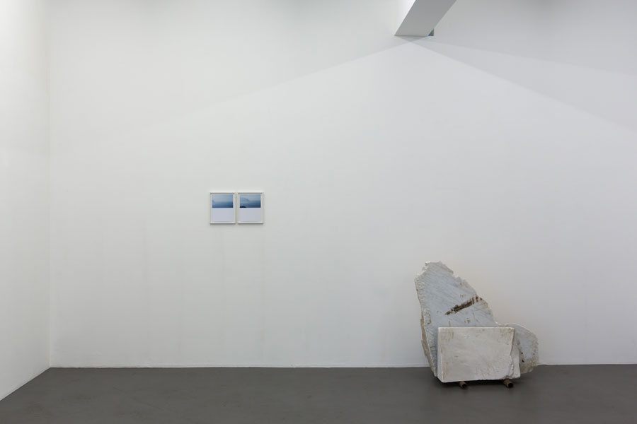 These two works can be seen as the starting point of the exhibition. Also in the exhibition, there are three steel rods, sticks, leaning against a wall. Of human size they take reference to the artist’s ancestry, a sort of genealogy. Its presence, which assumes responsibility and which puts the artist’s work in a lineage, proposes a way to look forward. Daniel Gustav Cramer is constantly going through a process of distilling his objects down to an essence, which captures an emotive response, something which links one object to another. Some of the works in this exhibition have been shown in the past – the crude marble blocks on show now, were stored and displayed in a steel and glass pavilion (1) in front of the sea during their trip from the mountains to the gallery – and others might re-occur in future ones; they become part of a narrative which is being told over many stages, many journeys.