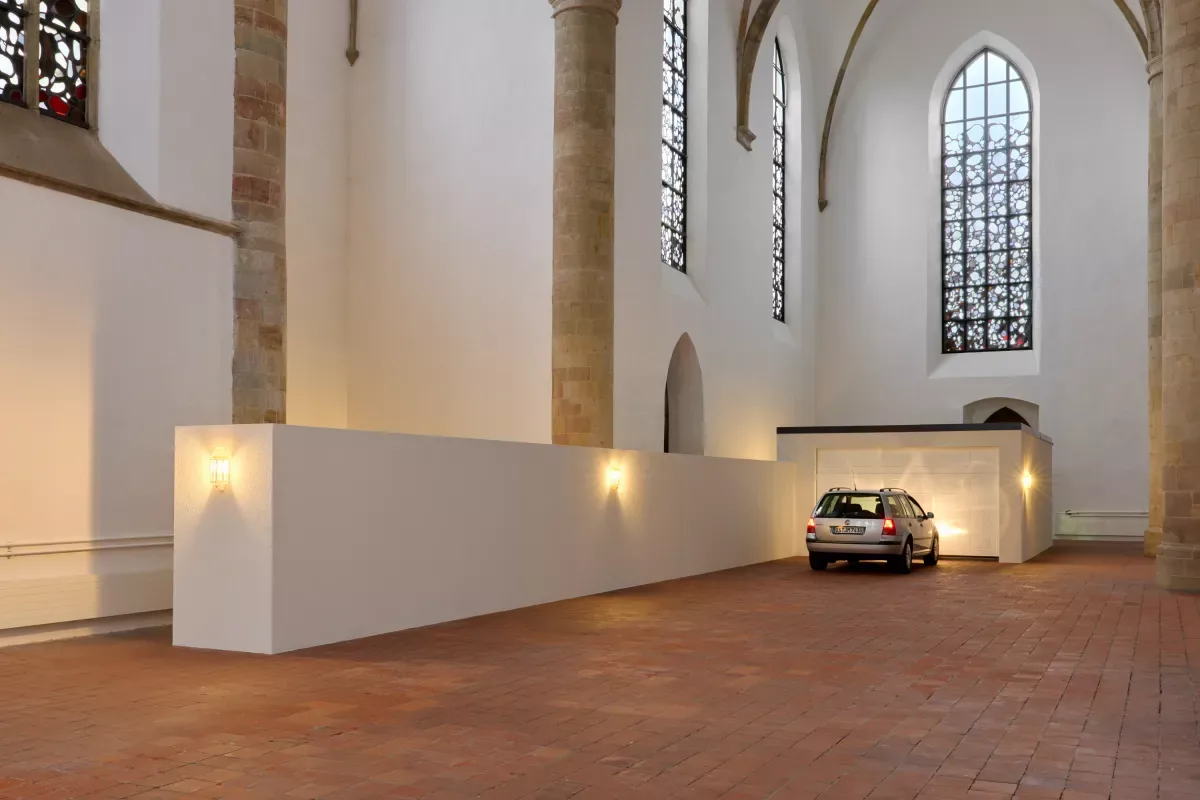 Steve Bishop’s solo exhibition On the Street Where You Live is on display at the Kunsthalle Osnabrück. He has created a new installation here. It focuses on the idea of timelessness. Belonging to a community and what this involves. And how family status symbols relate to this. [A status symbol shows that a person has a lot of money. For example, an expensive car or an expensive watch can be status symbols].