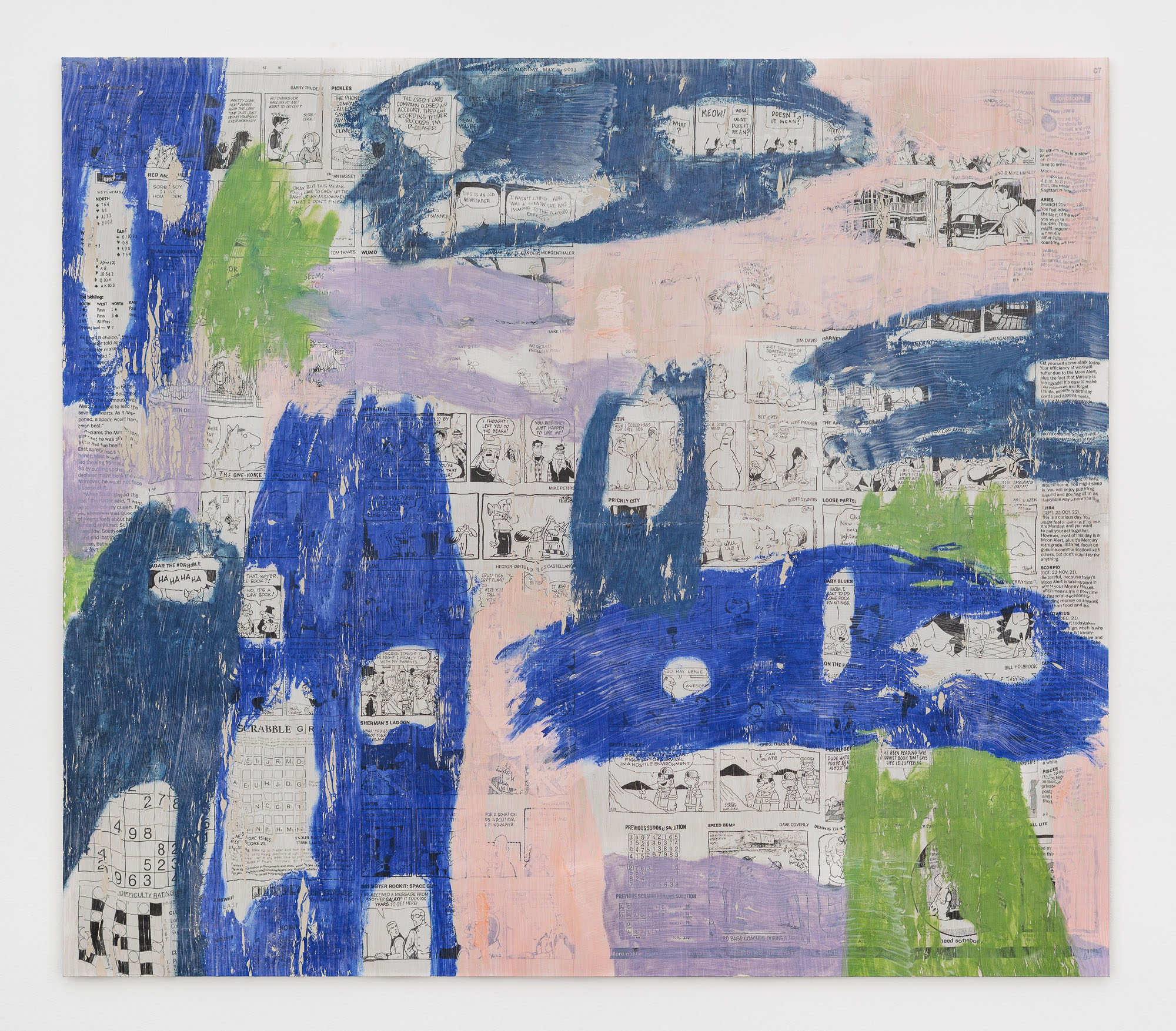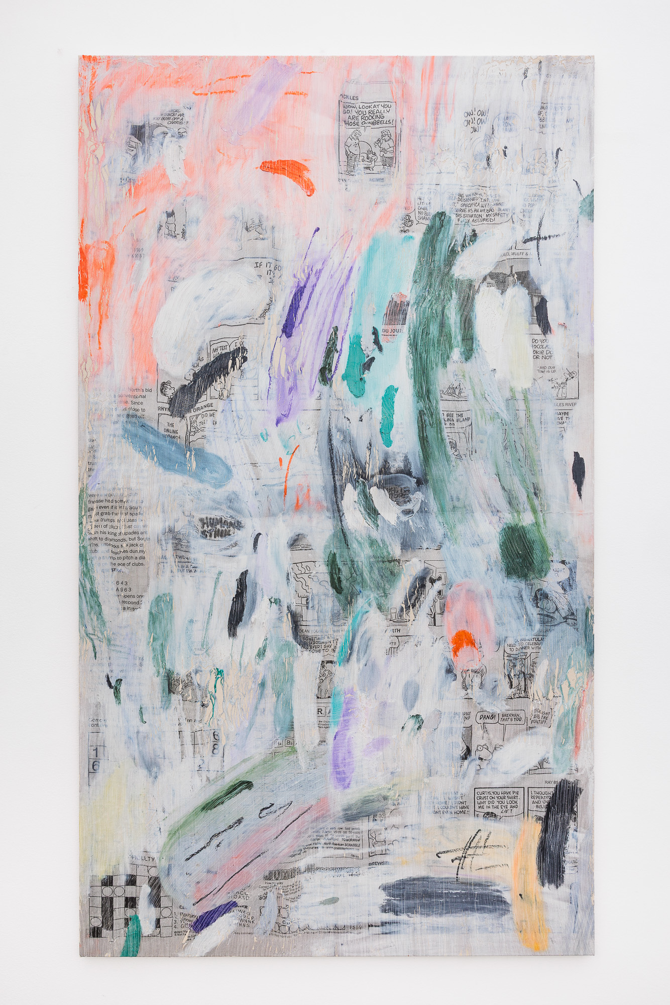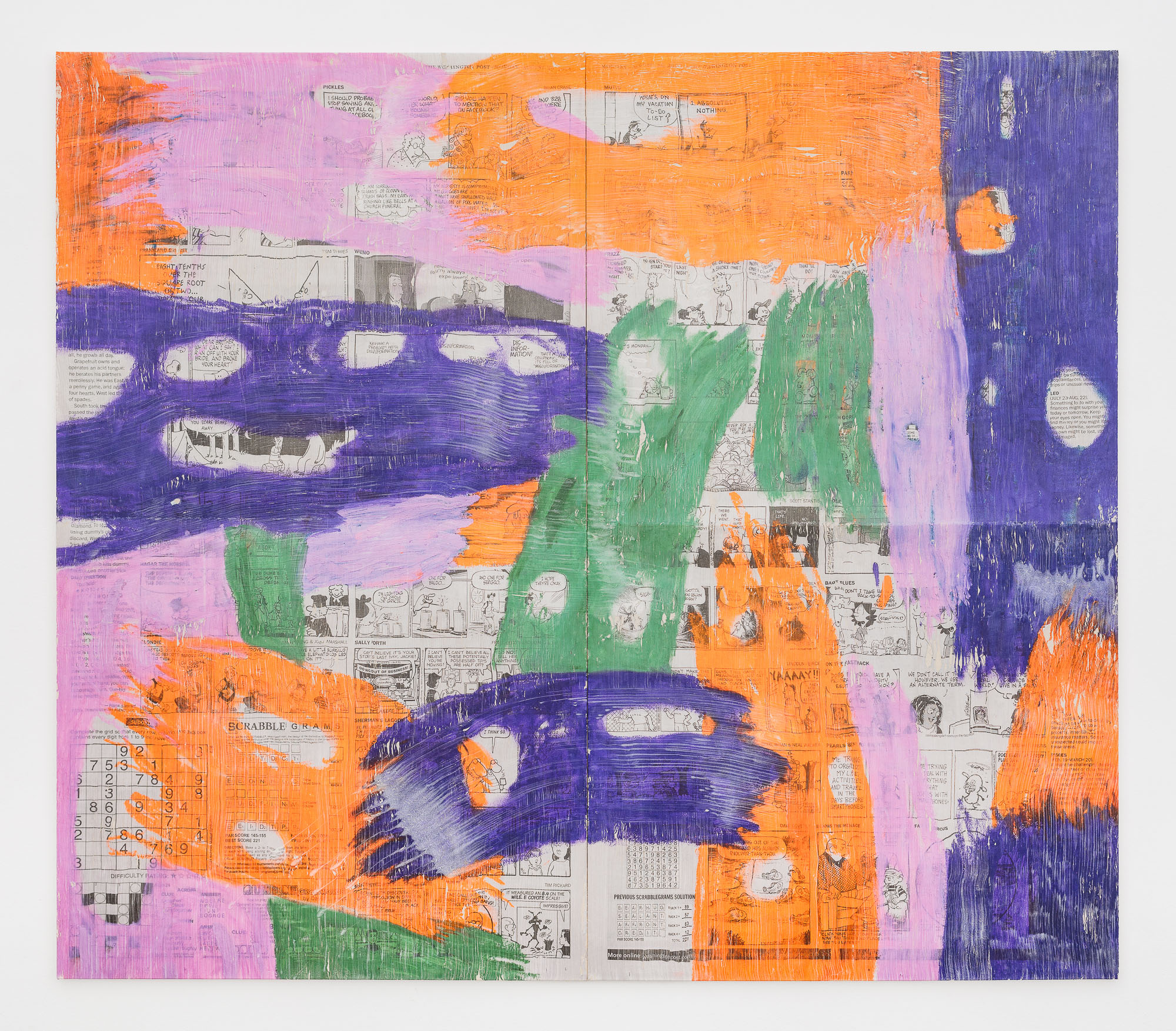 The works thus offer at least two interpretations. From a history of painting perspective, there is the dominance of colour structures between lines, connections or areas of colour, which, like abstract expressionism, advocate free form. A play of colours and forms can come to life here, although Danneberg’s work is hardly ‘pure’ painting, it is often corrupted by the diversity of media. Another historically motivated reading could see our newspaper pages as a modernist grid attempting to assert itself as the bearer of a rational structure despite limited visibility.