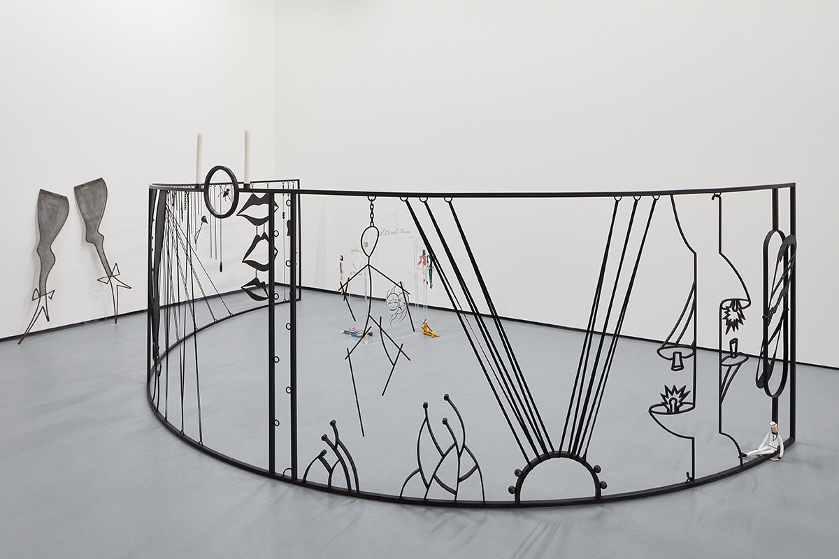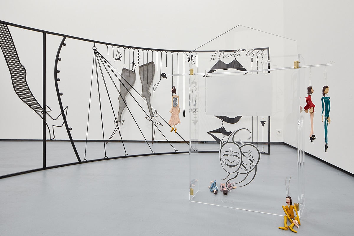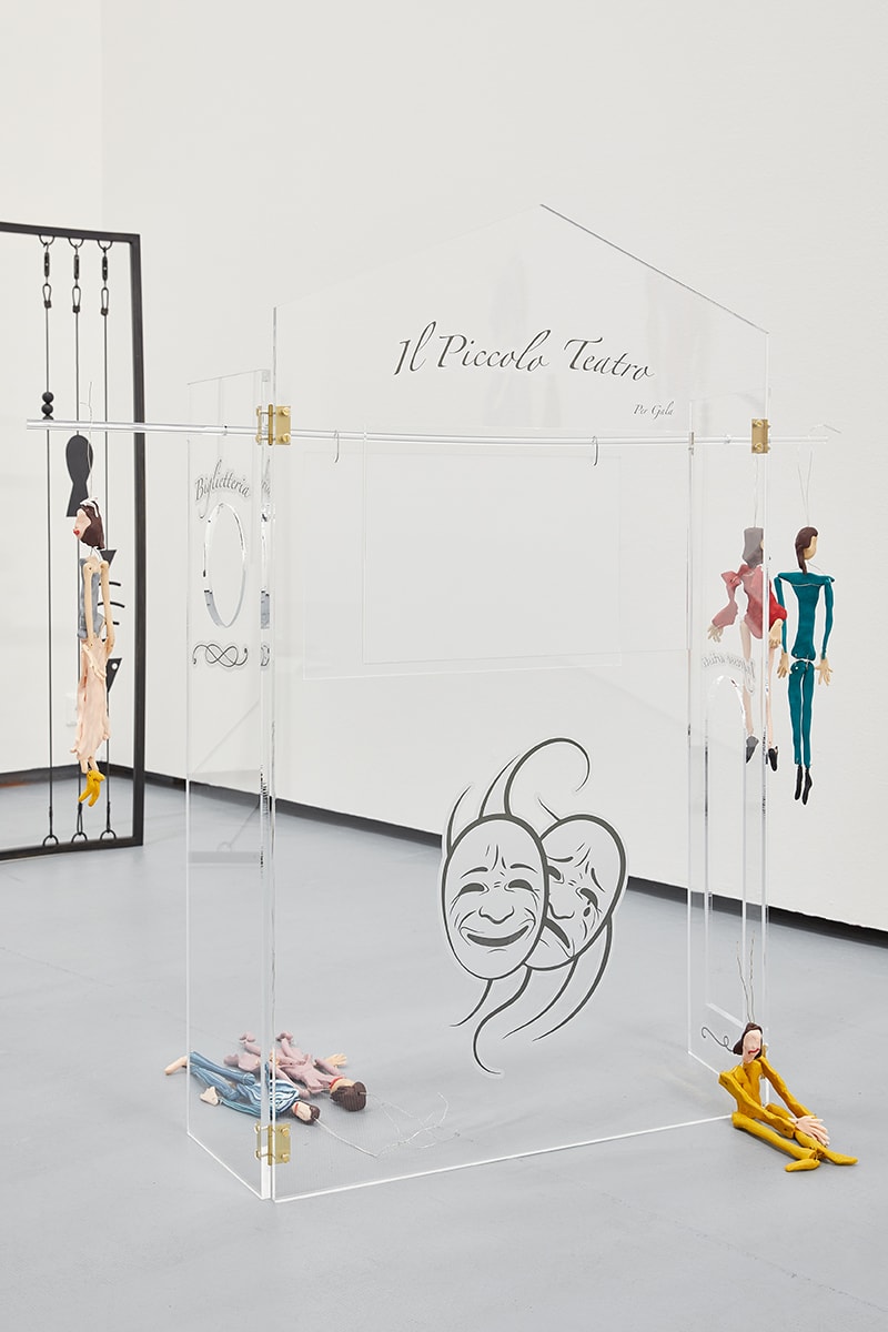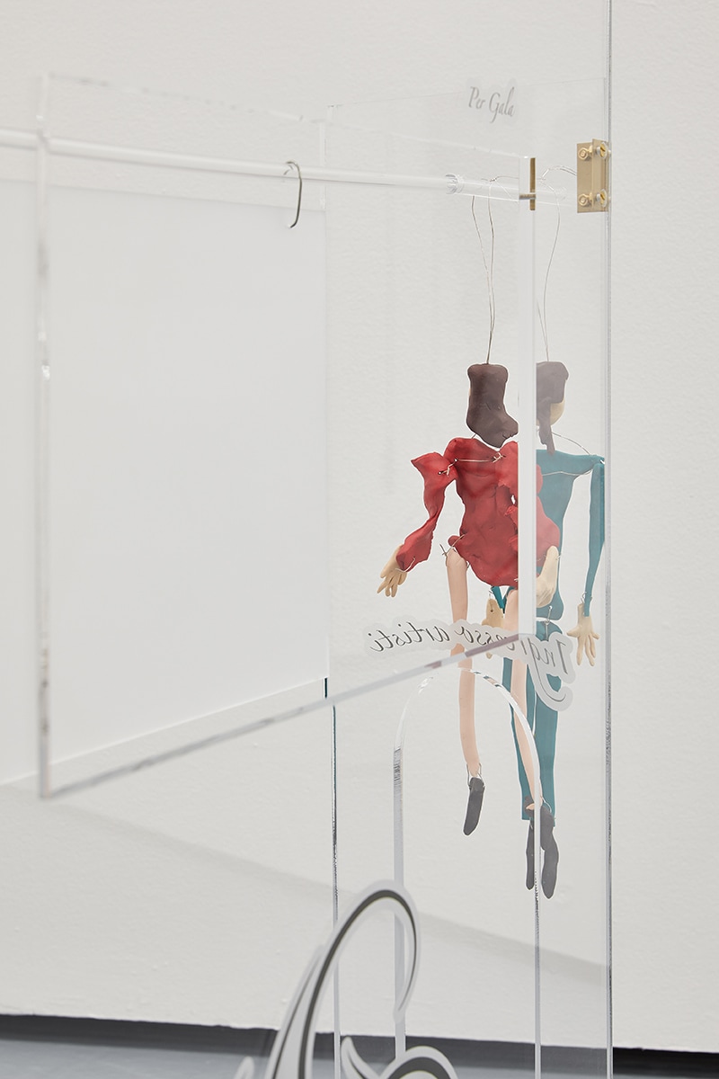 Although the last taboo in contemporary art may be honest illustrative childishness, not as an ironic position to mock and underline the author’s own importance, or another land of aesthetics that the field may invade and exploit, but as to really share something gentle and funny with the little ones, Julie Béna’s furry characters open deeper questions about the gendered constitution of art’s authorship. By performing the “artist-mother”, Béna reflects on the naturalized constitution of “single-” “available-” or simply “male-artist- without-commitment” and therefore denaturalizes it. What we see is not only a gesture or a manifestation of the theory or field of research of a conceived project, but simply an everyday lived reality that the artist doesn’t want to artificially divide from her own creative practice, as would rather be recommended to keep the “standards” of professionalism. This, however, also creates a challenge. An exhibition for children would only remain gestural, but what we see is equally an exhibition for adults. It is a development on Béna’s long term work on theatricality that (again) in performing certain exaggerated features of objects and characters, uncovers the supposed natural constitution of gender defining terms such as “cuteness”, “powerfulness”, “fragility”, “trickiness”, “wiseness”, “treacherousness” etc., which are an ideal source of material for fairy-tales. The exhibition does not stay at only the fairy-taleness, but further develops the themes of the theatrical and scenographic, always present in Béna’s work, also as creative mechanisms that allow for certain channelling. Béna presents the theater as a metaphor for a world where everything is staged, but emotions, laughter and tears, are, as with children, always experienced as real. By animating these stereotypes, by giving them bodies and needs, these monstrosities suddenly become fragile and weak. Finally in their weakness, they are able to be loved.